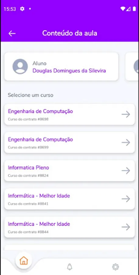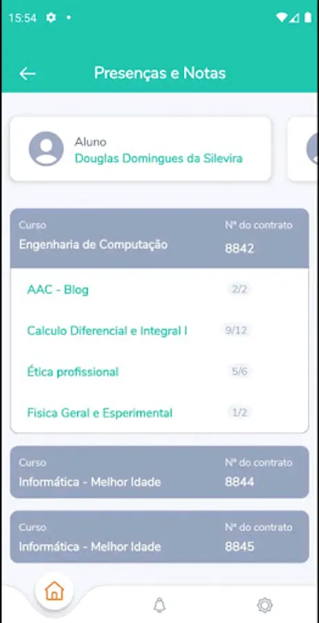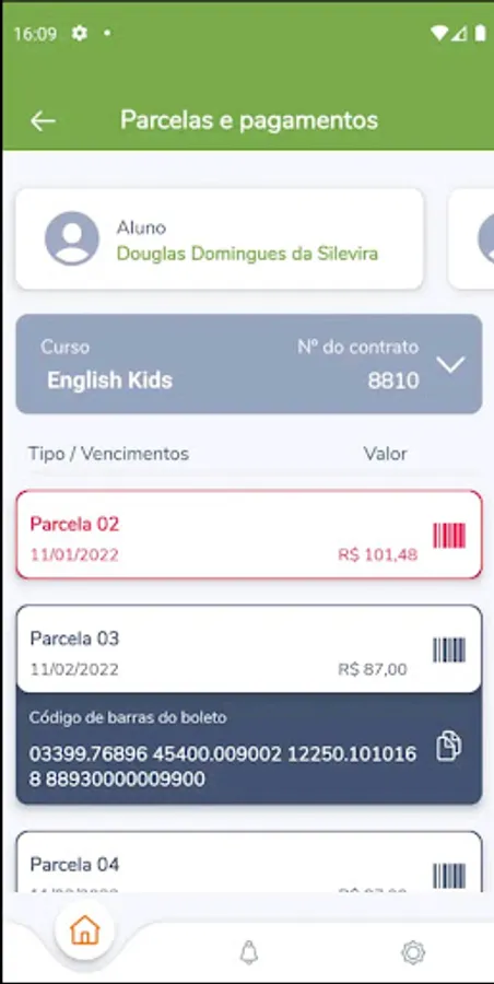 - Financial Situation: This tab provides a history of monthly payments and installment status, in addition to other payments such as educational material, enrollment, etc. The app uses a colored tag that signals whether they've been paid or overdue. It is possible to clearly visualize the amounts, payment dates and specifications of the debits.