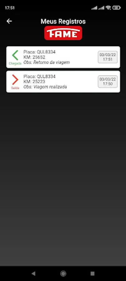 This application was developed for the company Fame, in order to optimize the control of departures and arrivals of vehicles used by employees.