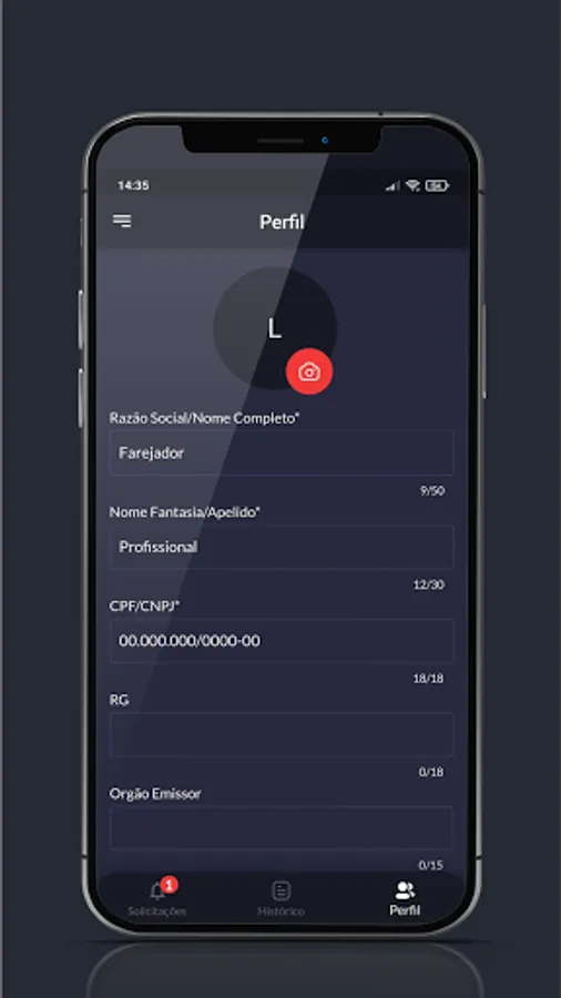 After downloading the application the Detective must register his profile, including name, e-mail, CPF / CNPJ, phone and address.