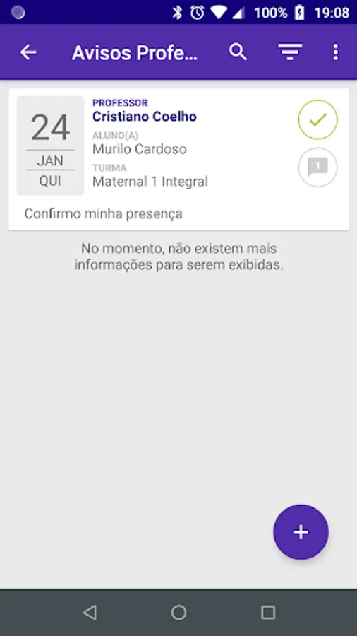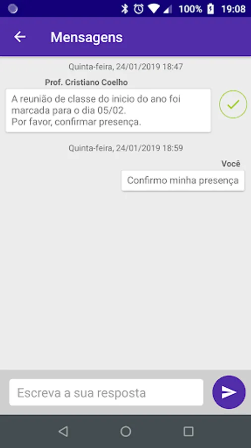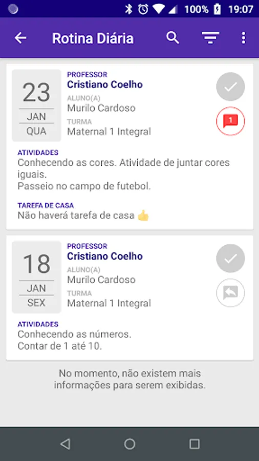 The Agenda Yázigi application encompasses the same fields as traditional paper agendas, in addition to offering new and exclusive areas for school monitoring. In this way, the application makes it possible to record daily routine information and details about information and various notices from the school, as well as recording events through images (photos). In addition, the application contains a message field, where the school can write important information for students and/or their families (guardians) and vice versa. It stands out, therefore, that the application allows that when a teacher registers information in any of the fields of the agenda or records a message for the application, the students or their guardians receive them instantly.