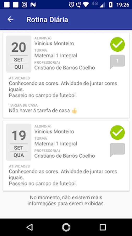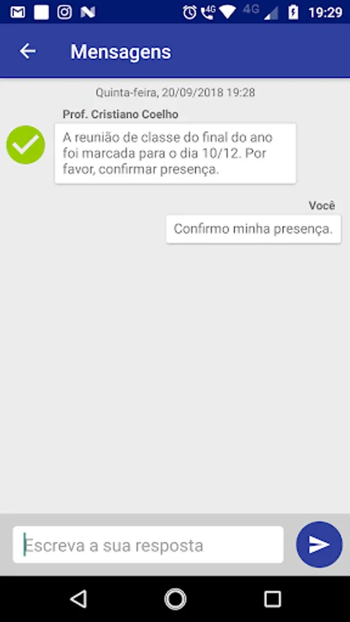 The Tellme School Mar and Sol School application encompasses the same fields as traditional paper calendars, as well as providing new and exclusive areas for school attendance. In this way, the application makes it possible to record from daily routine information and details about various information and warnings of the school, as well as recording events through images (photos). In addition, the application contains a message field, where the school can write important information for the students and / or their relatives (responsible) and vice versa. It should be noted, therefore, that when a teacher registers information in any of the calendar fields or records a message to the application, the students or their guardians receive them instantly.