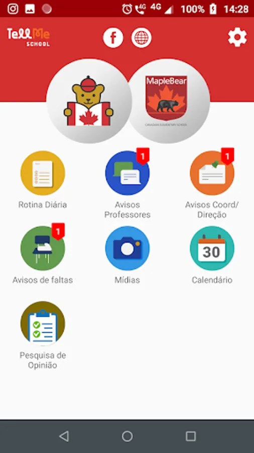 The Maple Bear School Tellme Catanduva application includes the same fields of traditional paper calendars, in addition to offering new and exclusive areas of school support. Thus, the application enables registration from daily routine information and details about information and several notices from the school, as well as record events through images (pictures). In addition, the application contains a message field, where the school can write important information to students and / or their families (guardians) and vice versa. It is noteworthy, therefore, that the application allows when a teacher record information on any of the agenda field or record a message to the application, students or their guardians receive them instantly.
