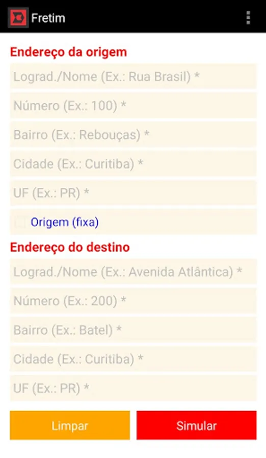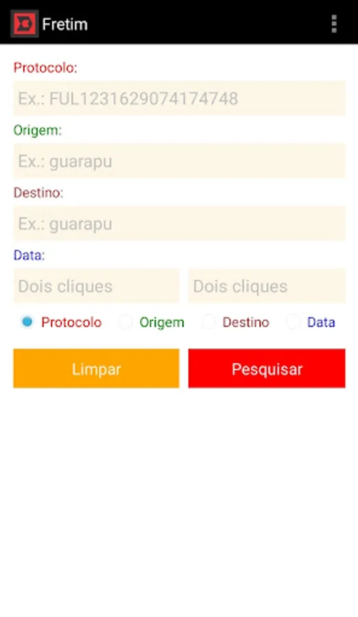 b) The second is per kilometer driven with a minimum value. E.g.: leave the field “Minimum price (R$)” with a value of 5 (five) and a value for the kilometer traveled in the field “Price per km (R$)”. If a simulation brings a value of R$2.00, it charges R$5.00 because this was the minimum value defined. If it goes beyond the defined minimum, it reverts to the price per kilometer traveled. Still authenticated with USER and PASSWORD, the motorcyclist/carrier can do freight searches by protocol number, origin or destination address and dates.
