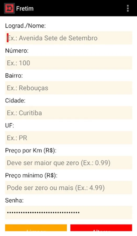 a) The first is per kilometer driven. E.g.: leave the field “Minimum price (R$)” with a value of 0 (zero) and a value for the kilometer traveled in the field “Price per km (R$)”.