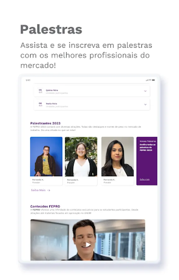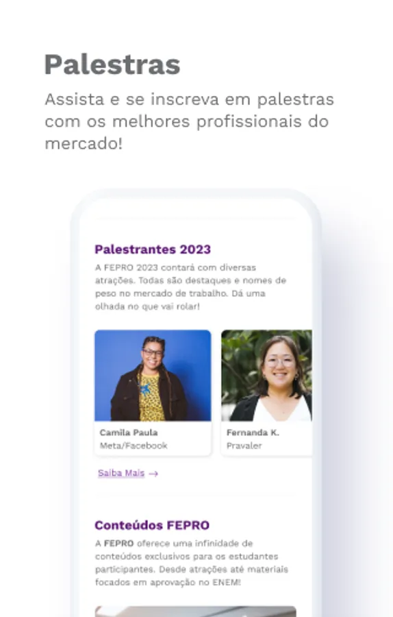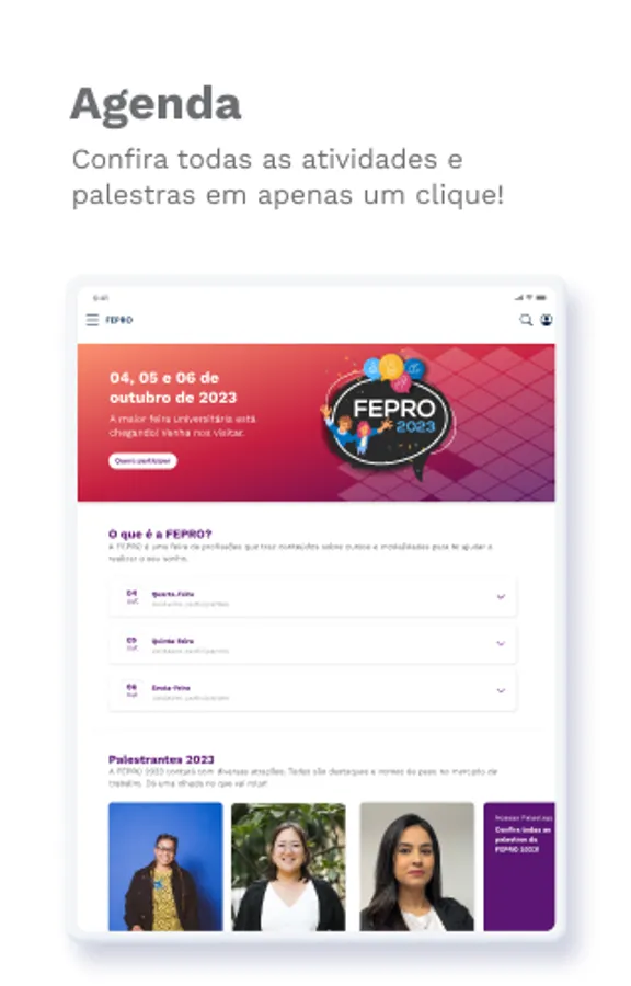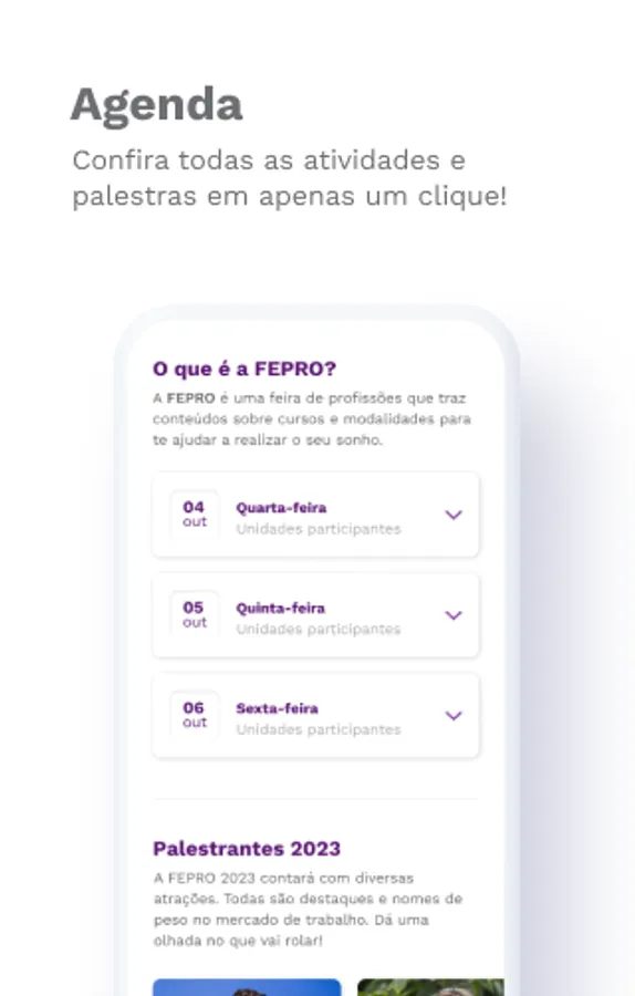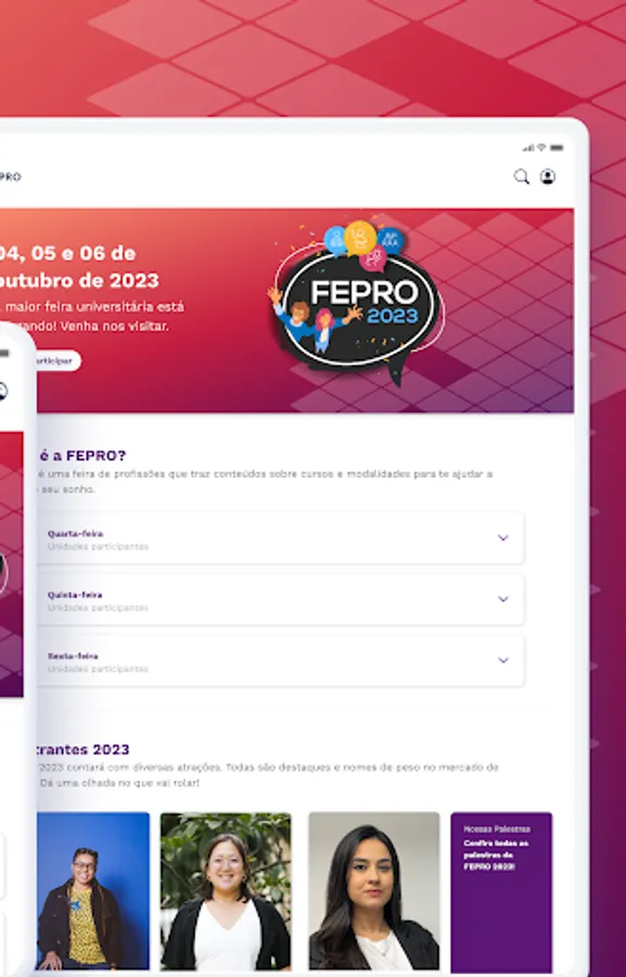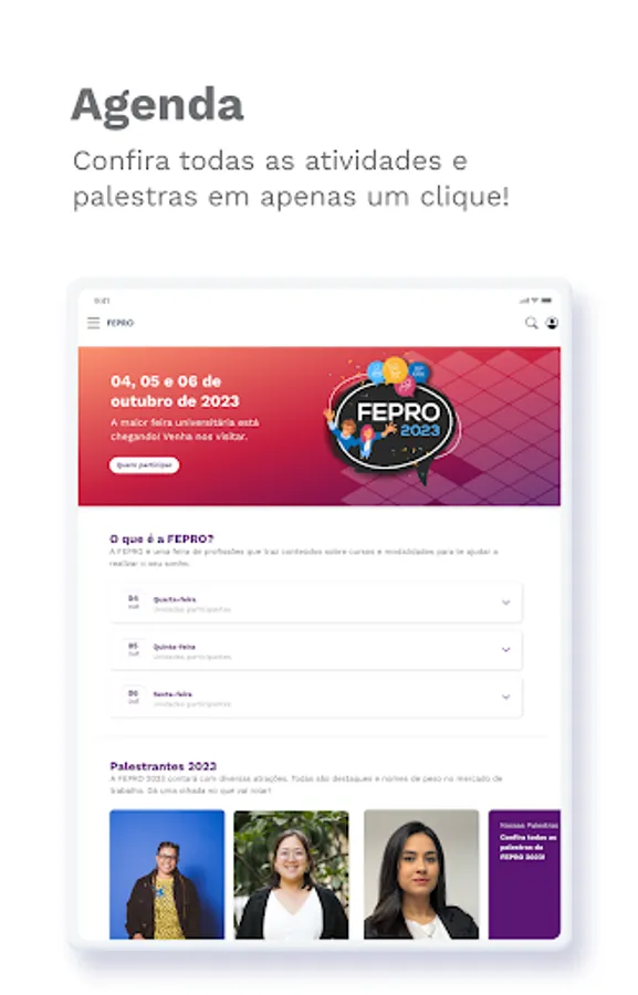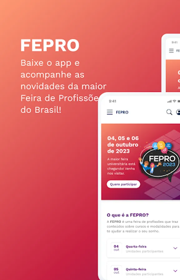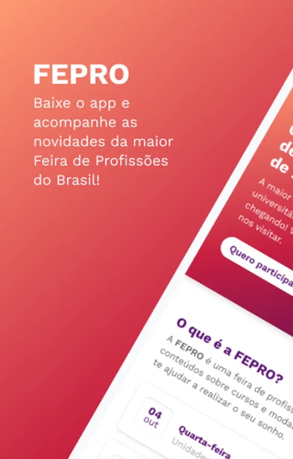 Discover a world of opportunities at FEPRO da Cruzeiro do Sul Educacional! Our app is your complete guide to explore the entire event, with content about lectures, partners, courses and universities, as well as information about careers. Browse the agenda, check in to the show, get support and share your experience.