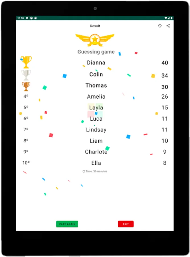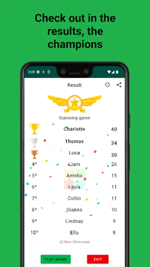 At the end, check the champions on the result screen. And in the history screen have access to all your records.