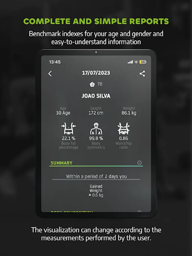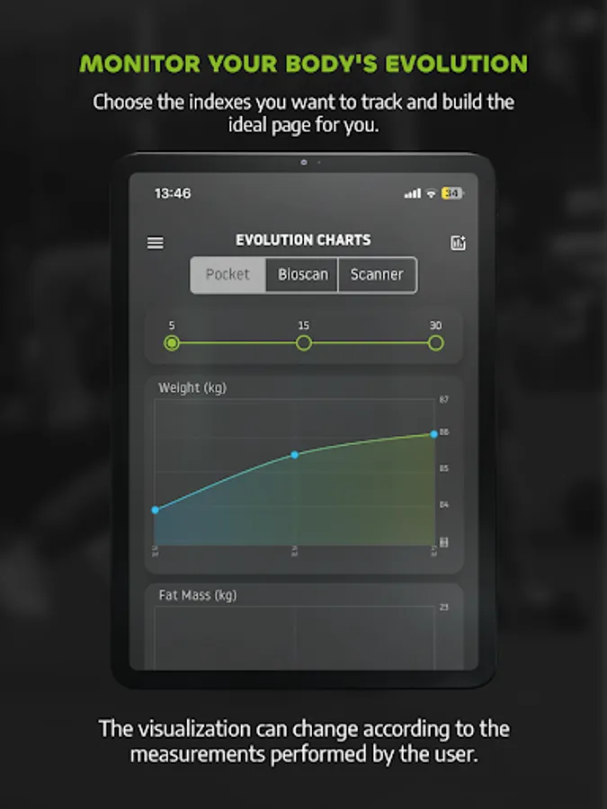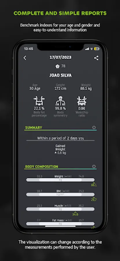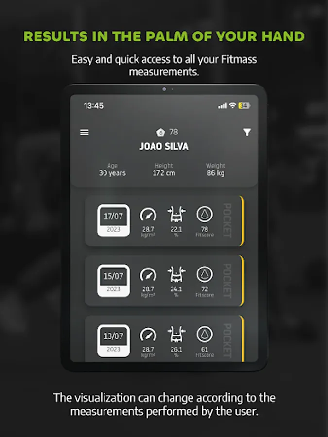 The Fitmass App is a comprehensive tool to access and control data from body measurements through bioimpedance, either by scale, cell phone or body scanner. Track your progress, view progress charts, share your measurements, set goals and monitor progress against them. Ideal for anyone, the app offers accurate and valuable insights into body composition, circumferences, postural deviations, cardiovascular risk and much more.