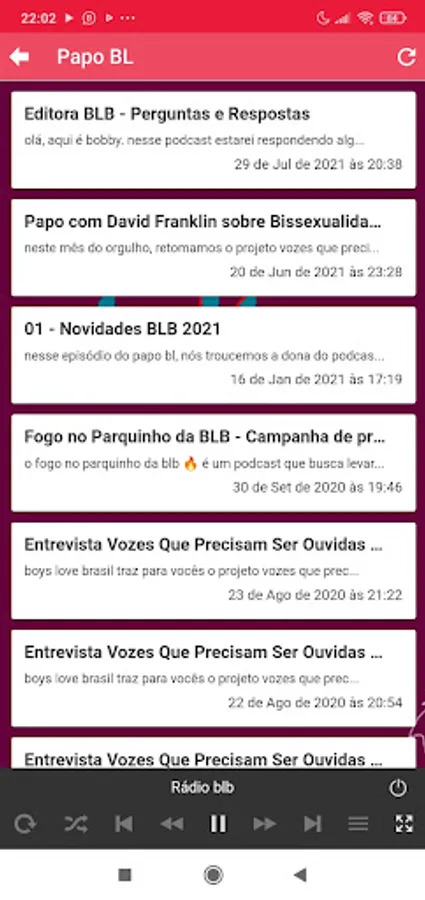Rádio Boys Love Brasil, (blb) brings news about Boys Love, Girls Love, K-pop, doramas, series shows and about the LGBTQIAP+ community. In our application you will also find news, reviews and reviews, as well as concert coverage. Here you can find a chat to connect with friends while listening to our radio or answering one of our quizes. Also find all LGBTQIAP+ books released by blb publisher here in Brazil. During our radio's live programming, you can ask for your favorite song via chat and WhatsApp.