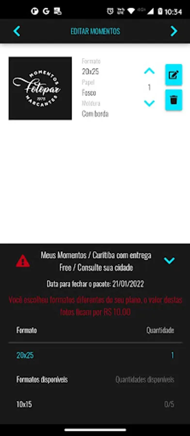 By downloading the application you can choose to hire individual photo development or in packages, the photos are in 10x15 size and high quality photo paper! In the 'package development' option, we have an amazing offer where you develop 10 photos monthly from 29.90 and you can still receive your photos at home or pick up in our store!
