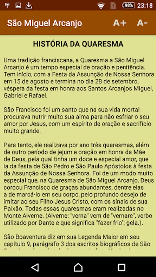 Saint Michael Lent is an application developed in Portuguese (Brazil) and has no ads. The main purpose of the app. Lent is to honor God the Father, the Blessed Virgin Mary and the Archangel Saint Michael. Lent is a Franciscan tradition for a special time of prayer and penance. It begins, with the Feast of the Assumption of Our Lady on August 15, and ends on September 28, the eve of the Feast of Archangels Michael, Gabriel and Raphael, on September 29.