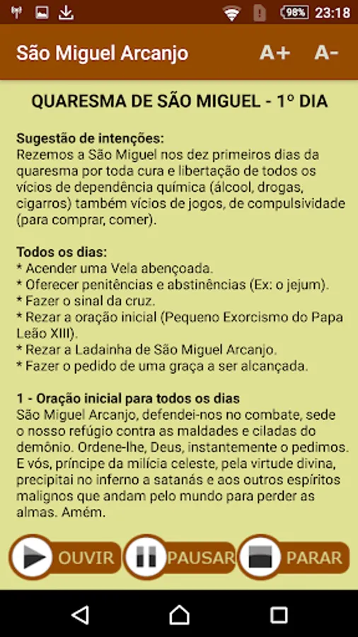 In addition to Lent, this application includes other prayers, such as the "Rosary of St. Michael" and "The Little Novena of St. Michael the Archangel". In addition to the texts of these prayers, you can, if you wish, "listen to the audios" to accompany Lent, the Rosary and Novena.