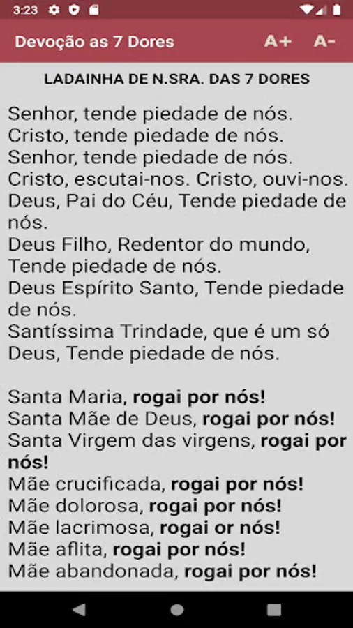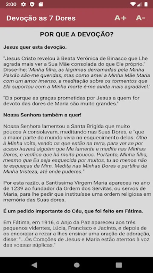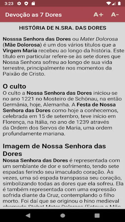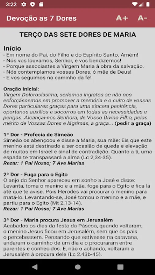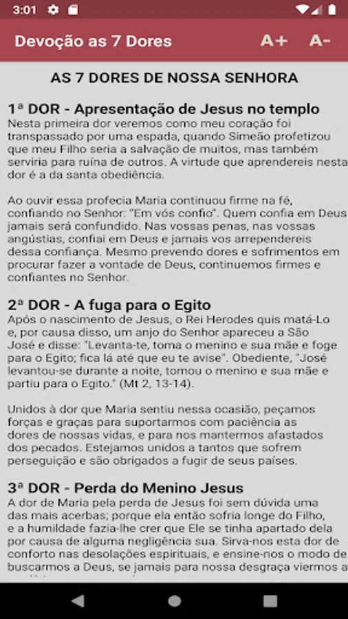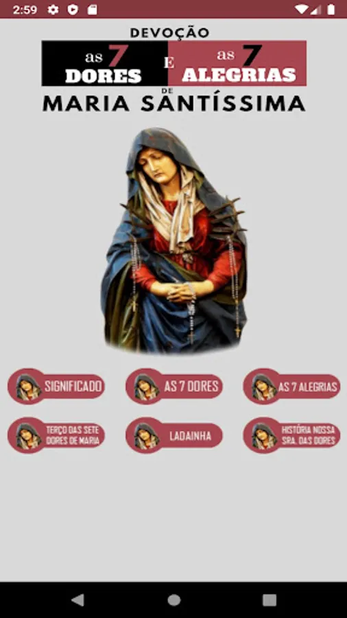 In this application you will find all information about the Devotion to the 7 Sorrows of Mary Most Holy. What are the 7 pains and 7 joys that have accompanied the entire life of Our Lady. Also available: How to pray the Rosary or Crown of the 7 Dores and the Litany. In addition to presenting the History of Nossa Senhora das Dores, you will also get to know the Promises to Devotees revealed to Santa Brígida, approved by the Catholic Church, as well as the revelations made by Jesus to Santo Afonso Maria de Ligório, for all devotees of Nossa Senhora das Pains.