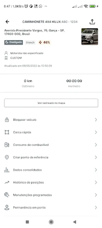 • Consolidated report containing information such as: odometer, idle time, hour meter, fuel consumption, number of stops, number of displacement and maximum speed reached