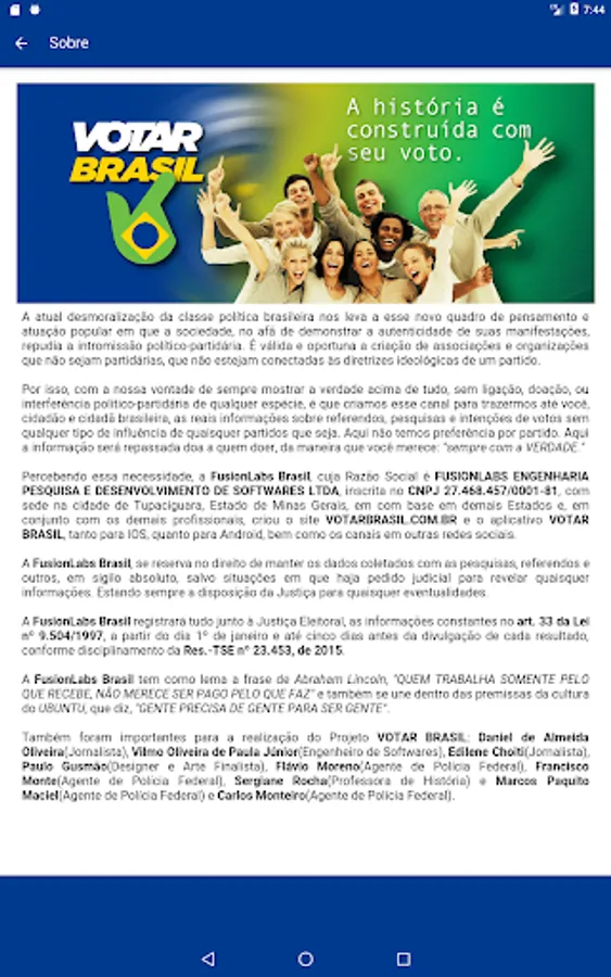 Realizing this need, FusionLabs Brazil, whose company title is FUSIONLABS ENGINEERING RESEARCH AND SOFTWARE LTD DEVELOPMENT, CNPJ 27,468,457 / 0001-81, headquartered in the town of Tupaciguara, Minas Gerais, on the basis of other States and, together with other professionals, created the VOTARBRASIL.COM.BR site as well as the channels on other social networks.
