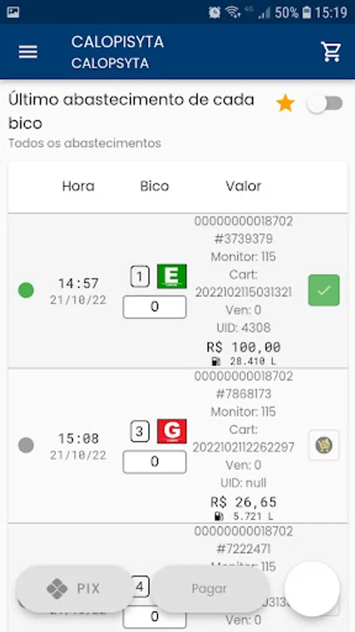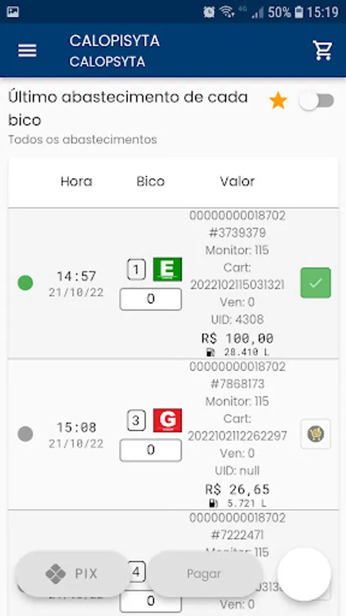 Application for payment with PiX at gas stations. Payment through the application allows discounts to be applied to supplies as well as the accumulation of points in the loyalty program.