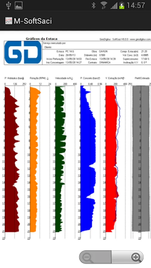 The M-SoftSaci allows tracking and visualization of graphs running in continuous flight auger piles type drilling machines that have installed the system for monitoring the Saci Geodigitus.
