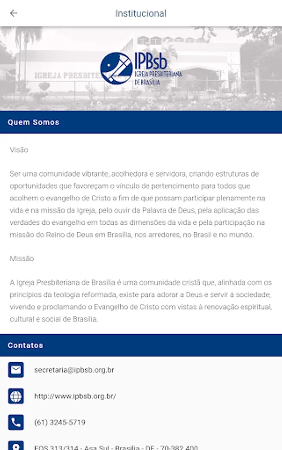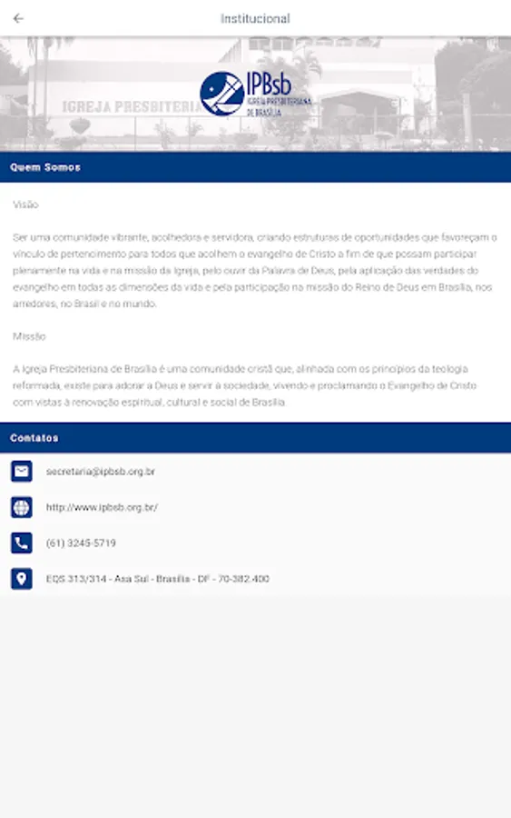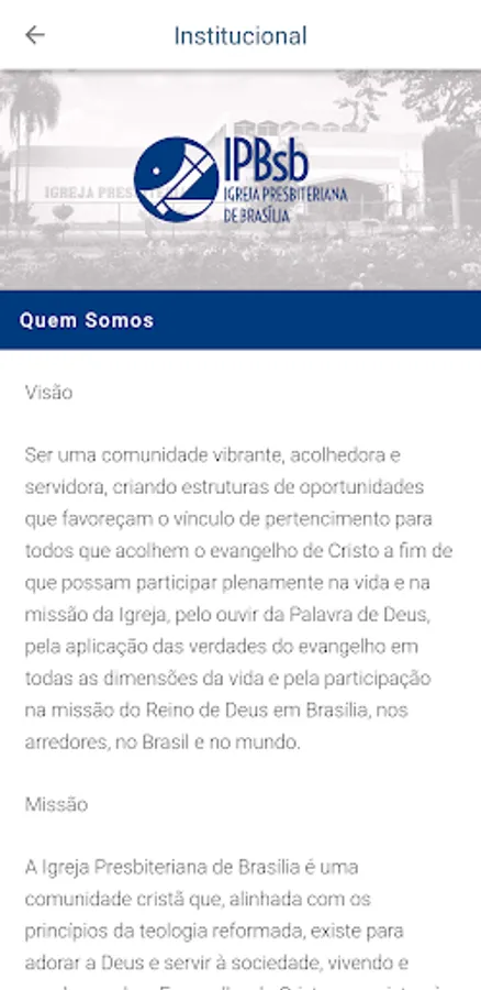 The Presbyterian Church of Brasilia is a Christian community that, in line with the principles of Reformed theology, there to worship God and serve society, living and proclaiming the Gospel of Christ to spiritual, cultural and social renewal of Brasilia.