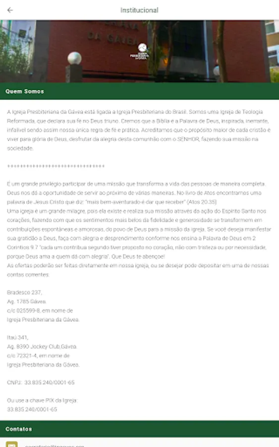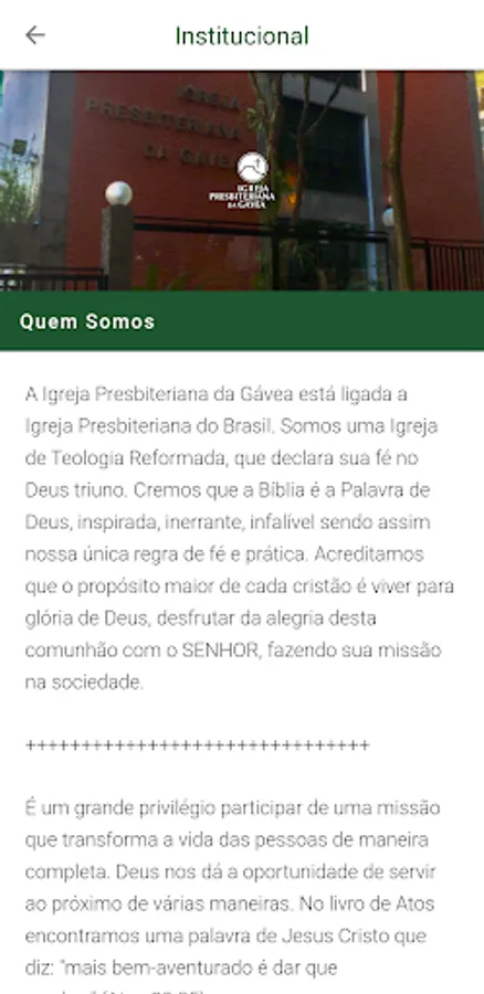 Welcome to the Gávea IP application (Gávea Presbyterian Church). Here you can learn more about our community, its schedules, newsletters, news, studies, etc.