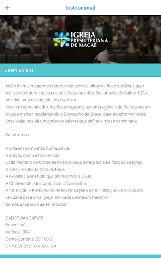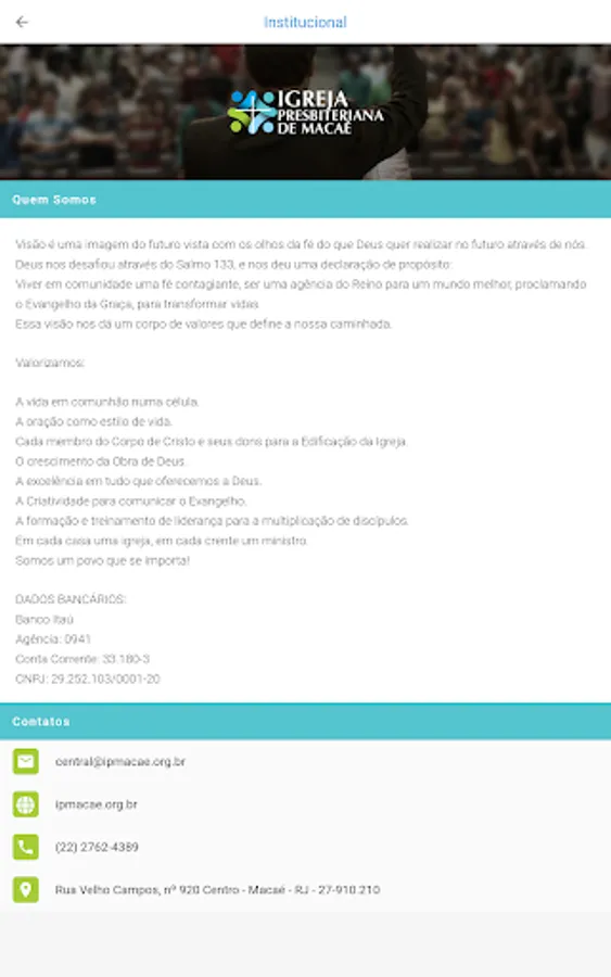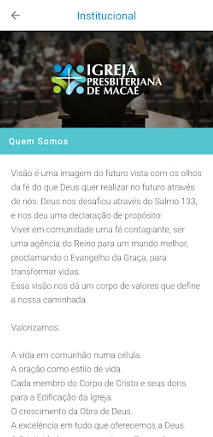 Welcome to the IPMacaé (Macaé Presbyterian Church) application. Here you can learn more about our community, its schedules, newsletters, news, studies, etc.