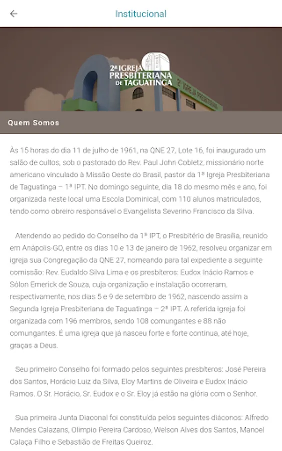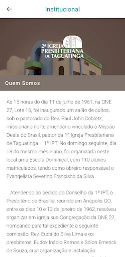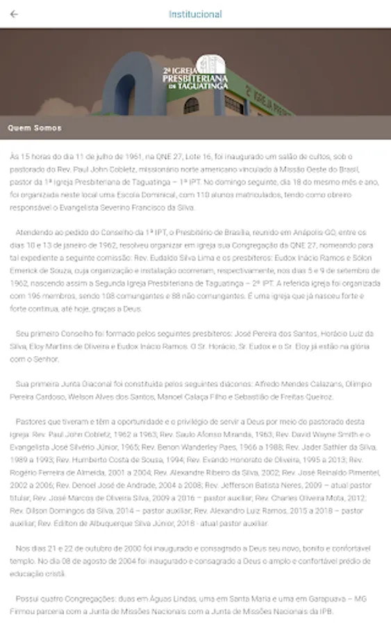 Welcome to the application of the Second IPT (Second Presbyterian Church of Taguatinga). Here you can learn more about our community, its schedules, newsletters, news, studies, etc.
