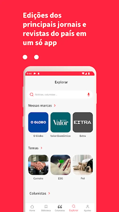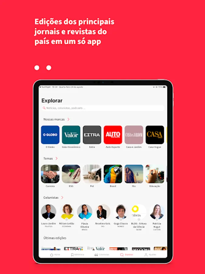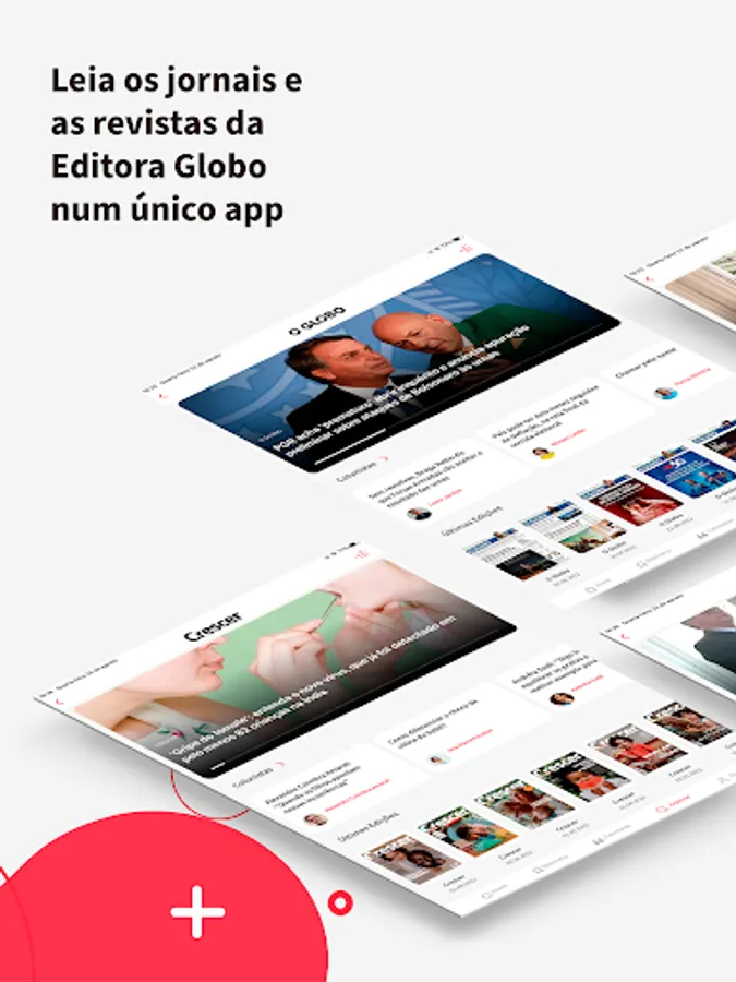 Unlimited access to all the exclusive content of newspapers O Globo, Valor Econômico and Extra, as well as magazines Vogue, Autoesporte, GQ, Época Negócios, PEGN, Casa e Jardim, Marie Claire, Glamor, Casa Vogue, Galileu, Crescer and Globo Rural. Broad content with analysis by the best experts and collaborators in the country and subscribers have access to materials without advertising.