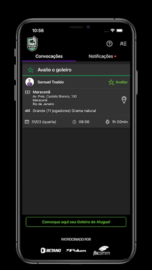 Just enter the date, time, location, type of field and number of goalkeepers. Payment can be made by credit card, boleto or bank transfer. For each rented goalkeeper, the customer earns points that are exchanged for discounts in the calls.