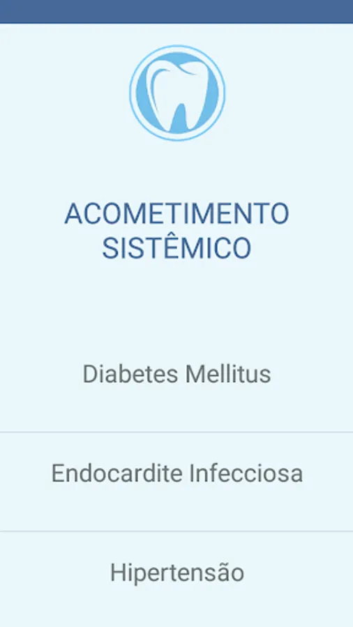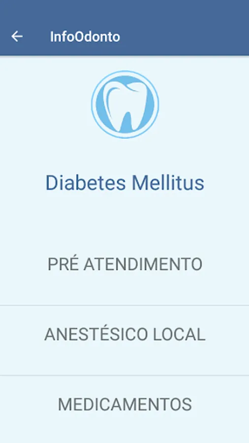 The InfoOdonto application is intended for dental professionals and academics, in order to help and quickly and objectively clarify any doubts in the care of patients who have some type of systemic involvement (Bacterial Endocarditis, Pregnancy, Hypertension, Patients using bisphosphonates , Diabetes Mellitus and Immunosuppressed). The approach will be divided into three topics for each affection: Pre - Service, Local Anesthetic and Medicines, since they are the most relevant topics regarding dental care, thus containing complete information regarding each affection described.