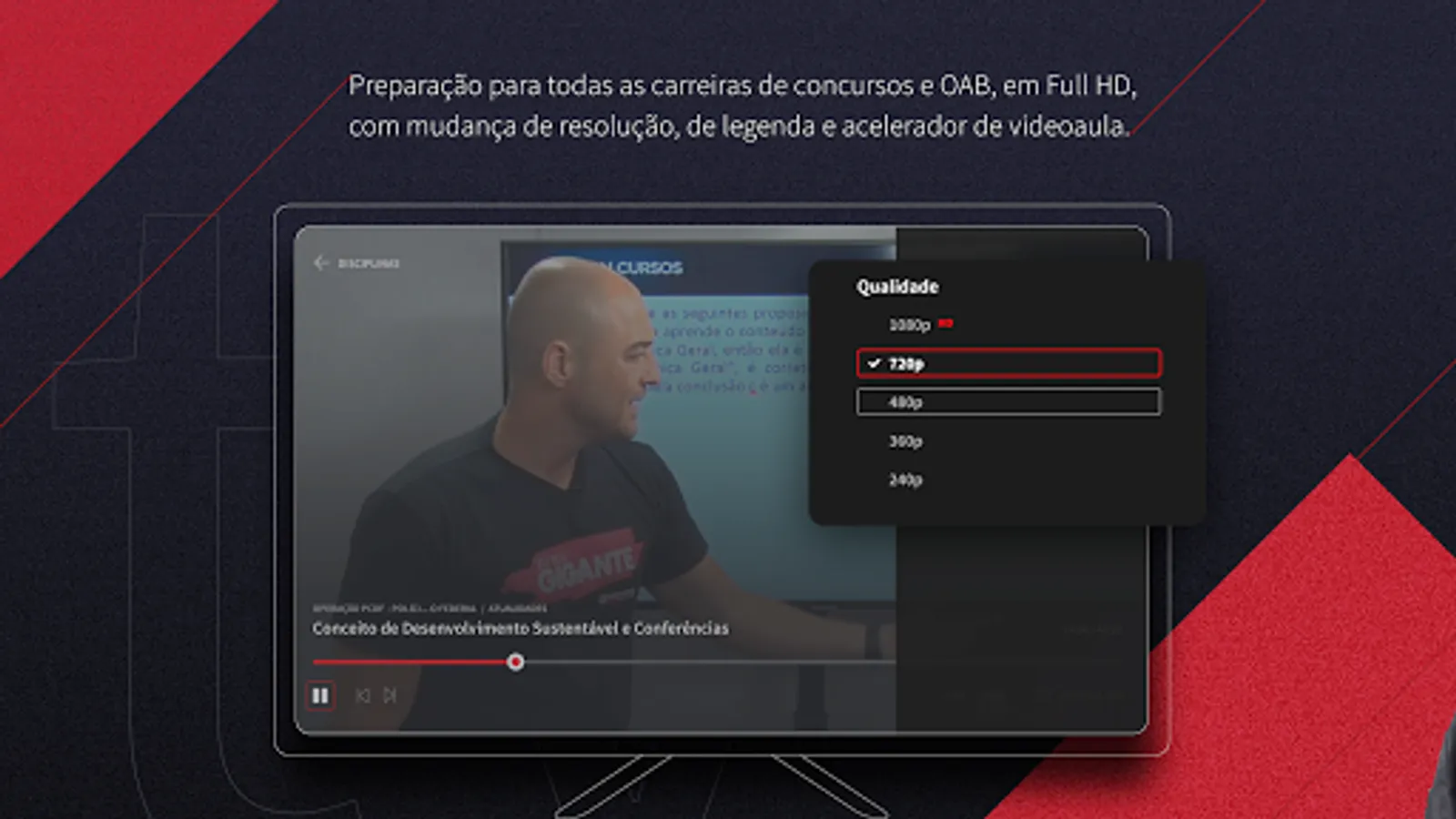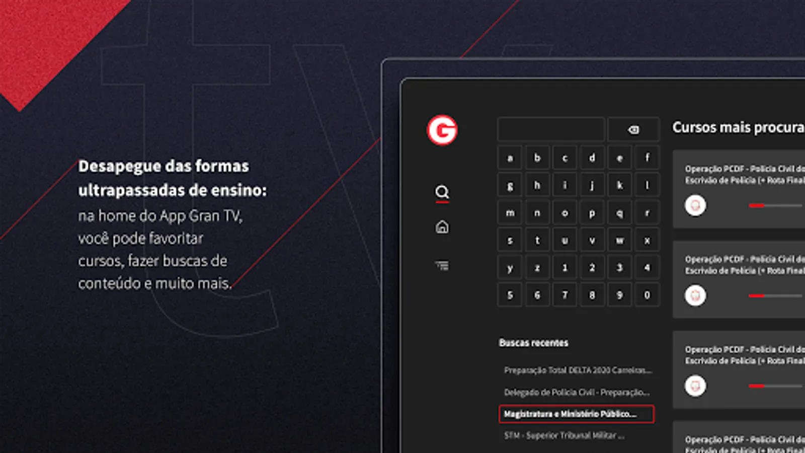 The Gran Cursos Online TV application, exclusive, allows that, even without a laptop and even without a cell phone, YOU can use it to study for public exams and order exams watching video classes on TV, being able to speed up the video and search for courses favorites in your Unlimited Subscription.