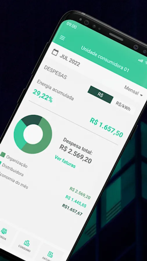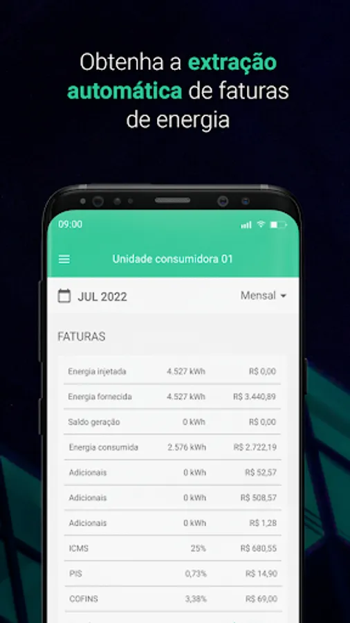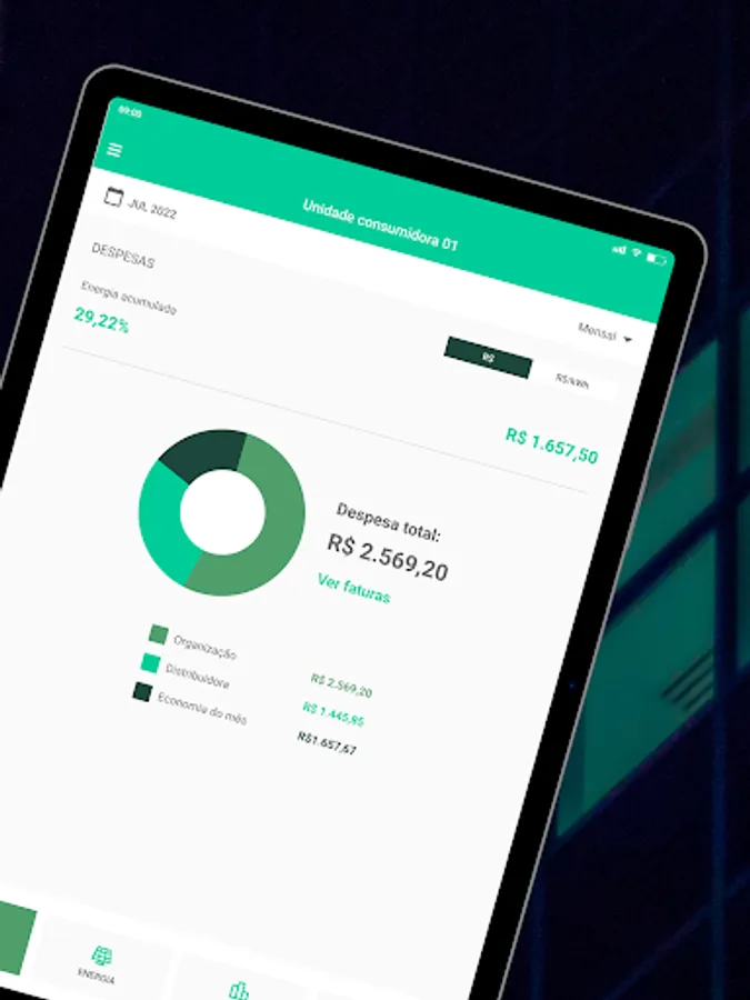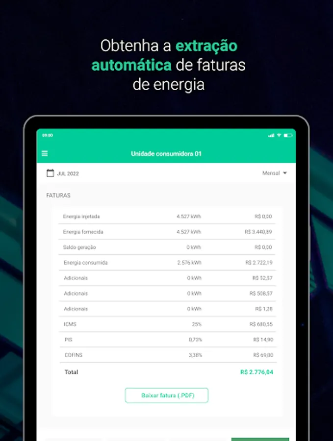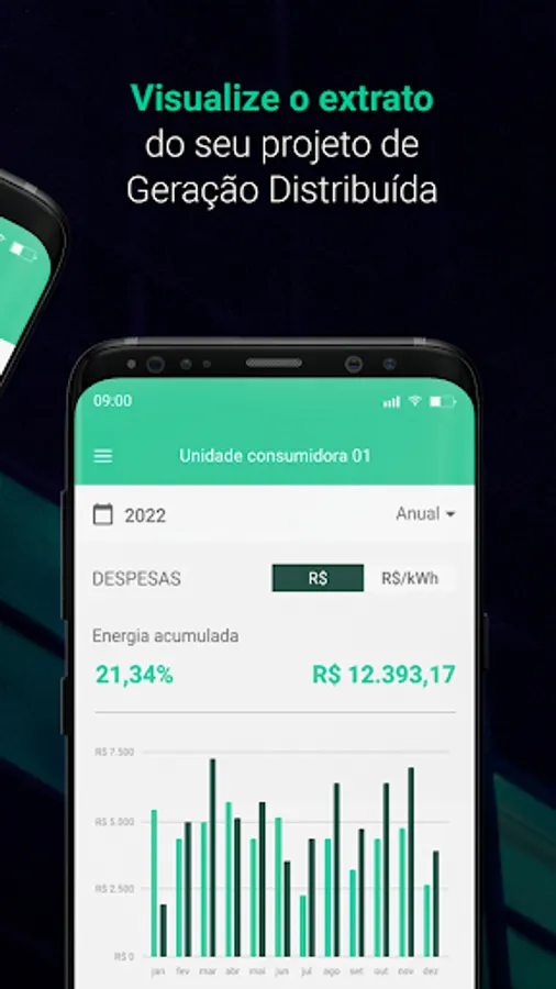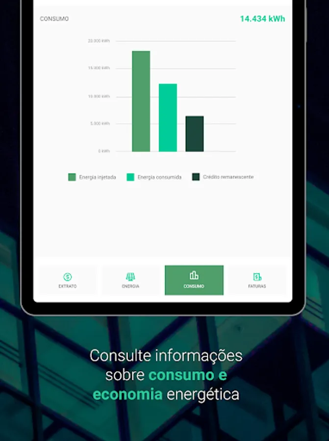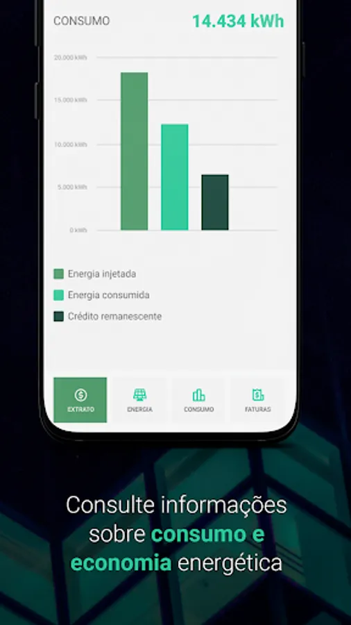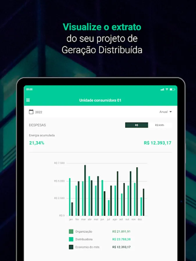 O aplicativo exibe informações de consumo de energia com uma variedade de ferramentas que te ajudam a acompanhar sua economia no projeto de geração distribuída.