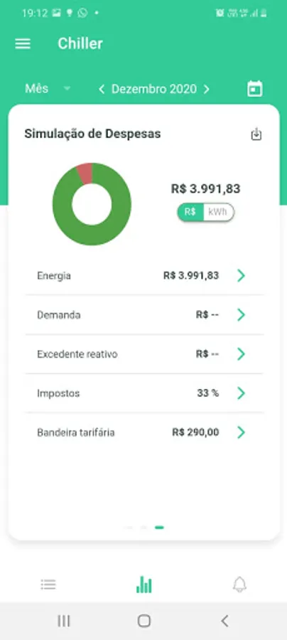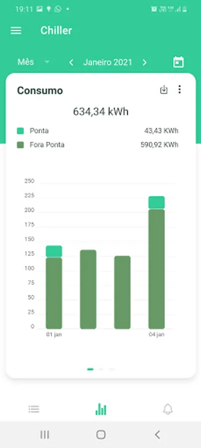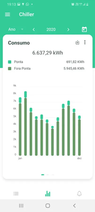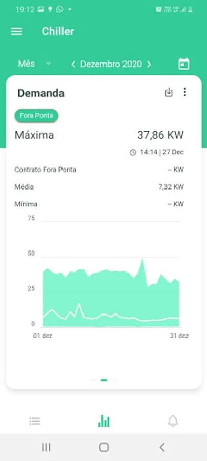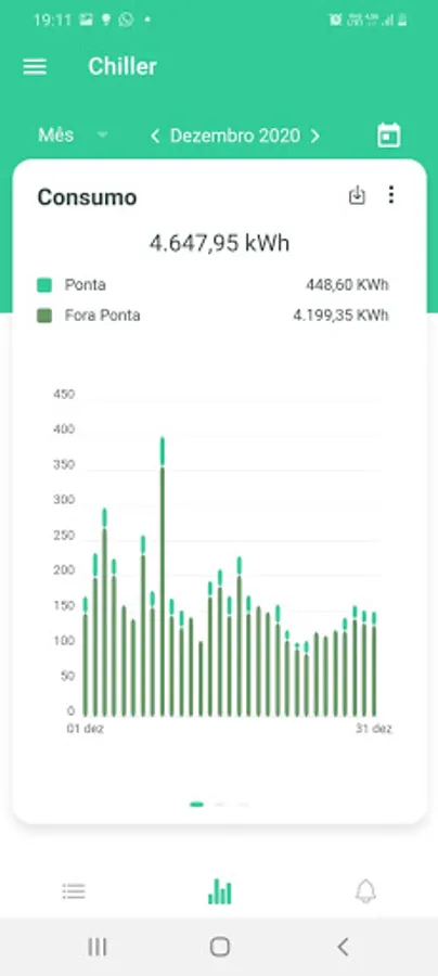 Starting from the GreenAnt dashboard, the application offers access to consumption graphs that offer detailed information on peak and off-peak consumption, consumption forecast and typical consumption of registered consumer units. In addition, it is also possible to view demand graphs and a simulation of expenses for each registered meter. Another functionality offered in the application, is the access to notifications and alerts regarding possible surpluses in demand, loss of connection with the meter, among others.