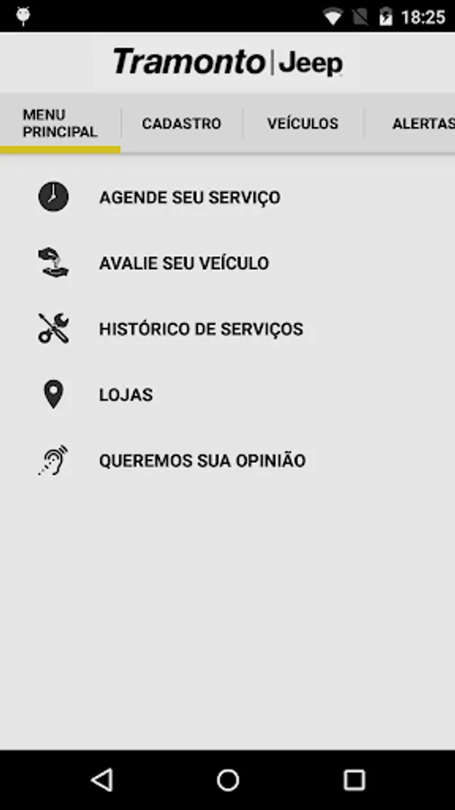 Application of the Tramonto Jeep dealer network. Download the application now and have access to online scheduling, consultation of service history and evaluation of your vehicle. In addition, Tramonto will help you remember maintenance, expiry of your license, expiry of IPVA and insurance of your vehicle.