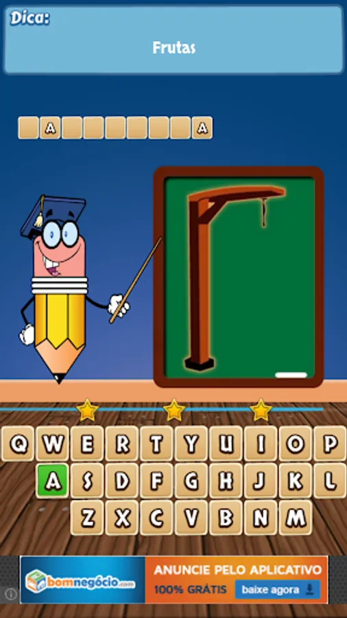 The game has nine categories and works as follows: there is a time limit to set the proposed word. If the time is exhausted, the game is ended and you return to the same phase. Each wrong letter, a part of the body of the doll will be drawn if all err, he will be hanged, and the game will end. Thus, back again to the same phase. Each correct letter, the word will be easier to be decrypted and if you hit, the game ends and goes to the next phase.