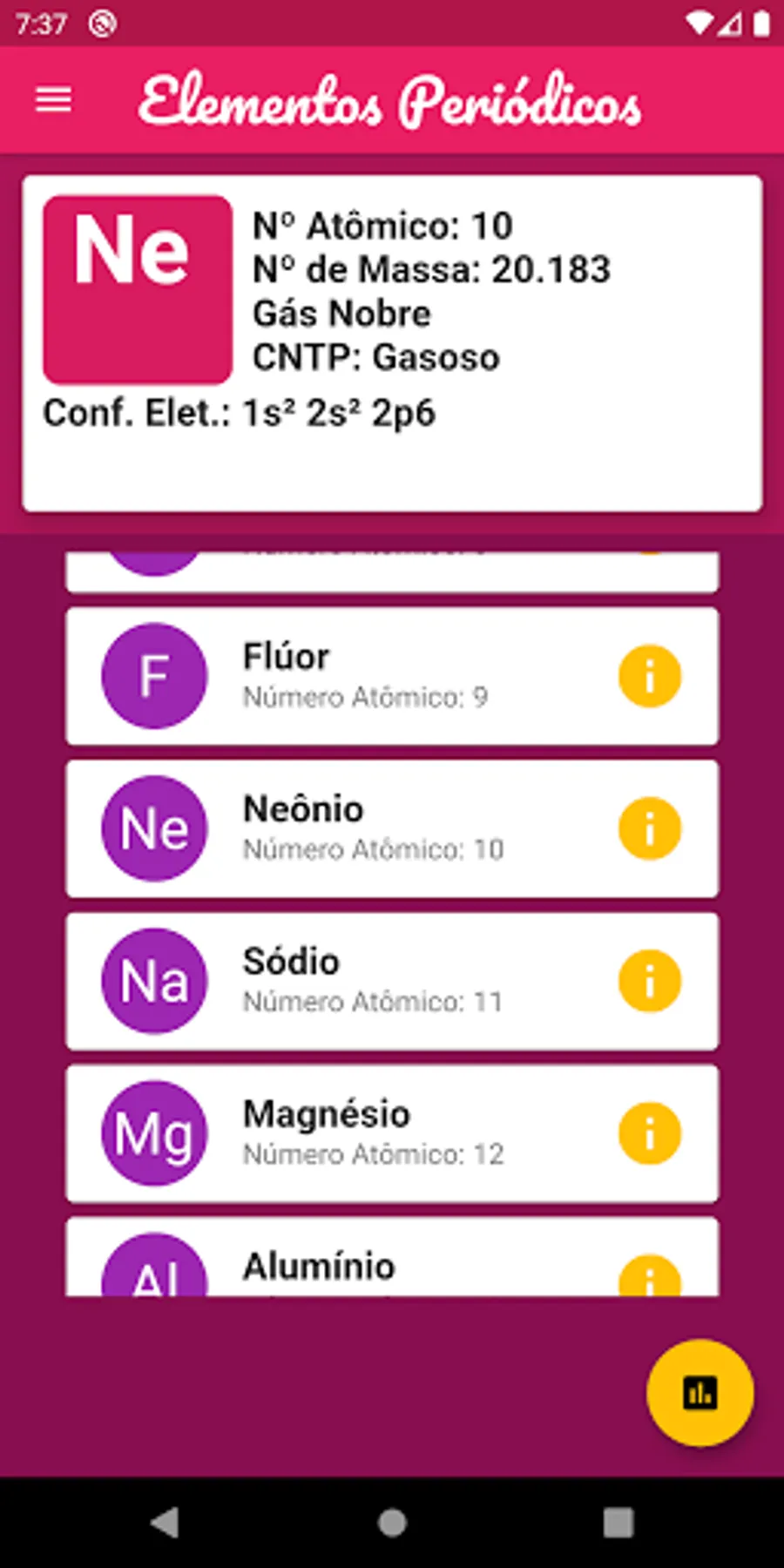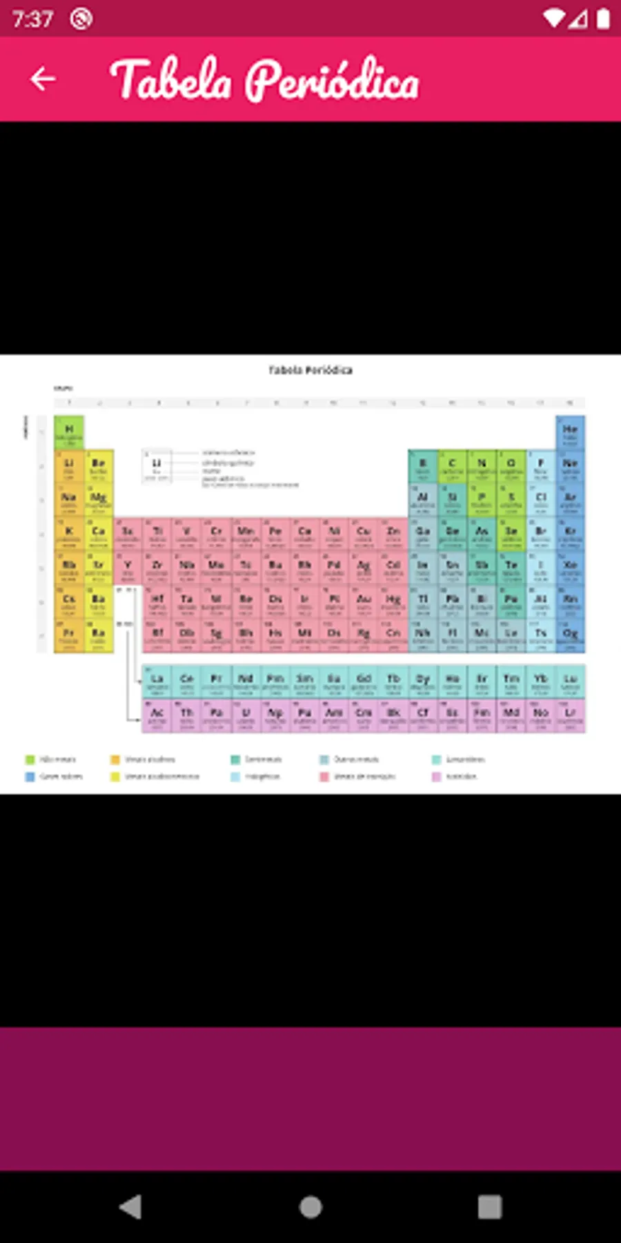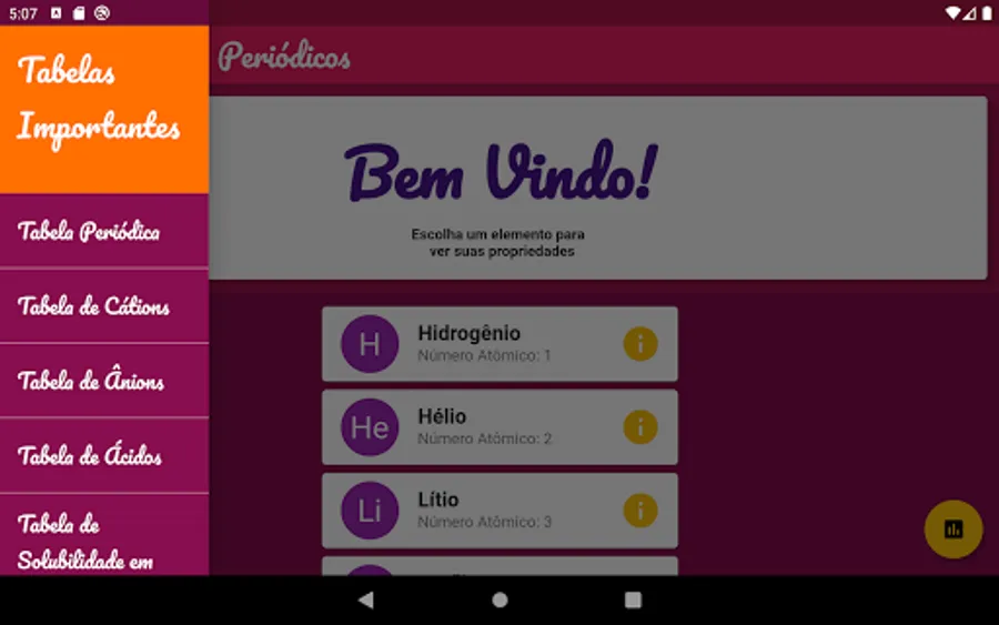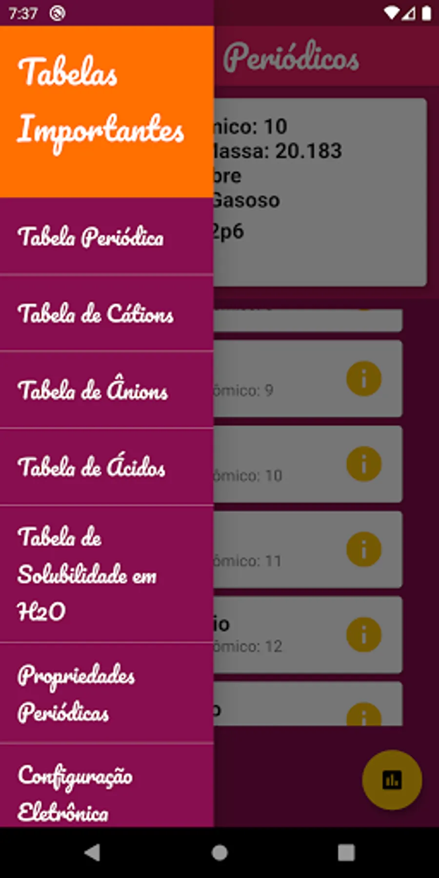 Here you will find the periodic table, its groups by family of elements and separate screens, tables of anions, cations and acids in addition to much more.