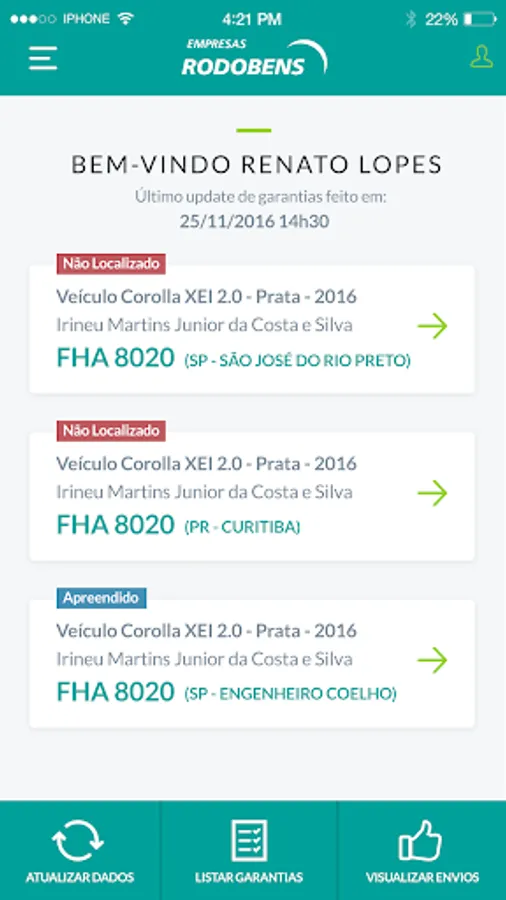 We created the GVC application is located, there you have access to vehicle listing to apprehend Company Rodobens. And this list is constantly updated with information that will facilitate research such as: Addresses, phone, plate, model, etc.
