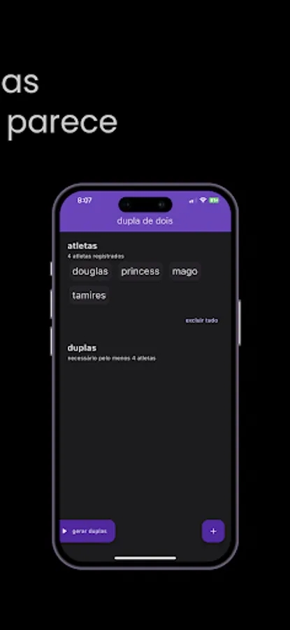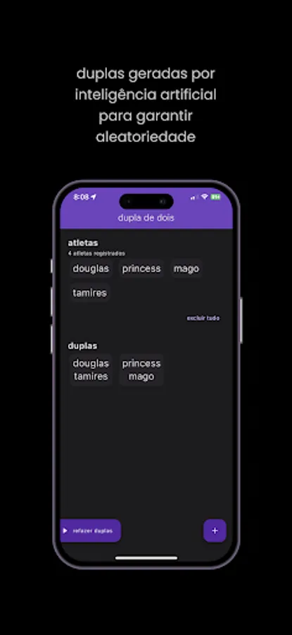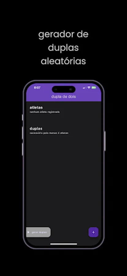 Want to do a doubles tournament? Beach Tennis? Footvolley? It doesn't matter the sport. Support all doubles sports. Simply enter the athletes' names and we generate the pairs randomly.