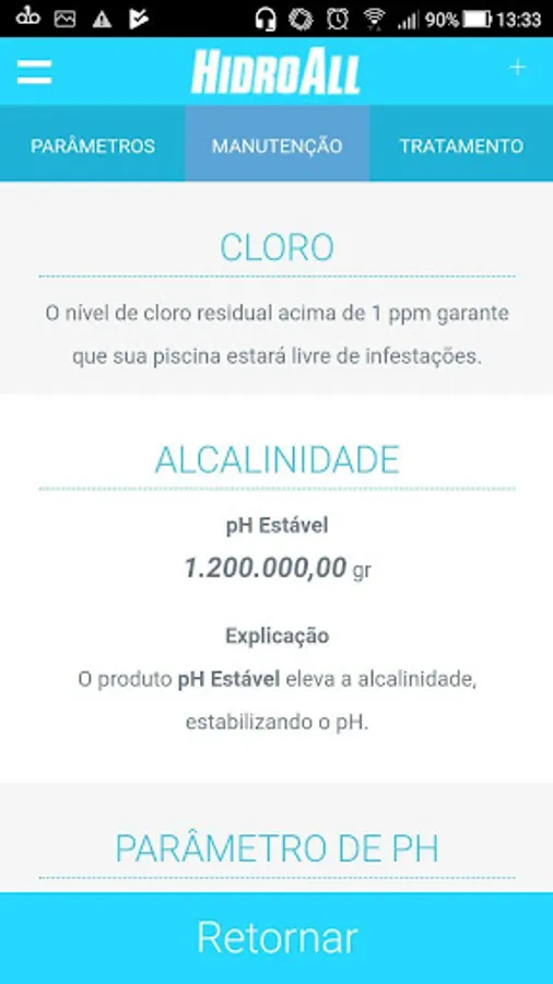 Treatment - select the information about the pool and get the right treatment, correct dosages for setting the residual chlorine, alkalinity, pH and calcium hardness. On this screen you can also view solutions to the main problems that occur in the water.
