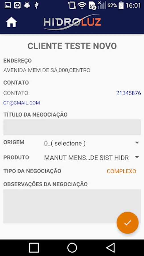 Comercial Hidroluz's application has emerged as a way to streamline and facilitate the whole process of customer service as a personal agenda integrated into the system, allowing to pass through all stages of a customer, from the register to the conclusion.