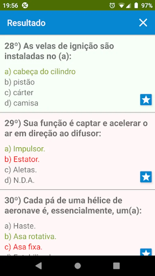 Each time you start a simulation, 20 random questions will be chosen (to maintain the ANAC test standard), at the end of each simulation you will be able to see the result showing the template with the marked answers, being able to see where you went wrong and use the results as a basis for studies.