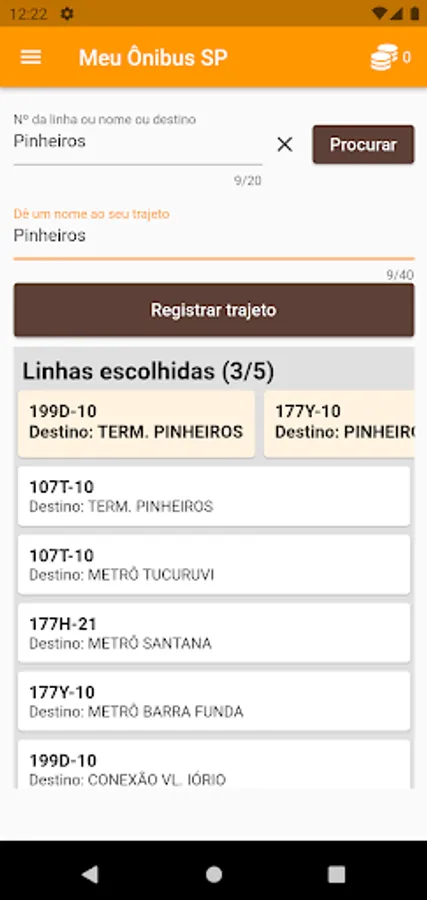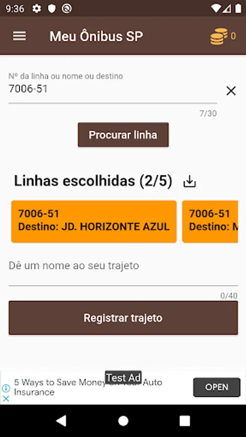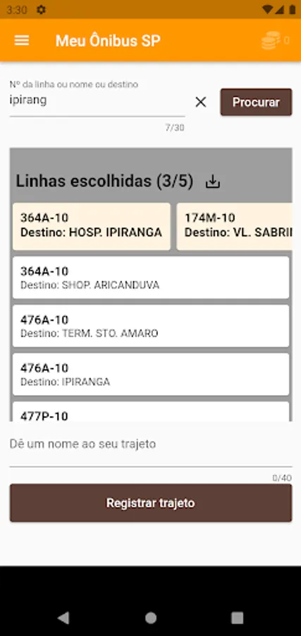 You can register several routine routes by entering a name for each one. When registering a route, just tap on it to see the map and available buses. For example, there may be 4 buses in circulation, 2 of each line that you indicated as useful.
