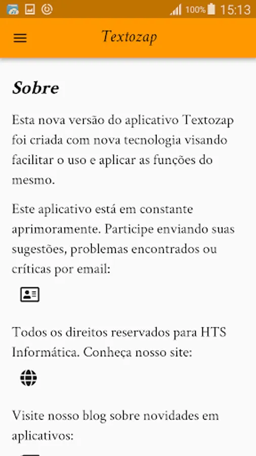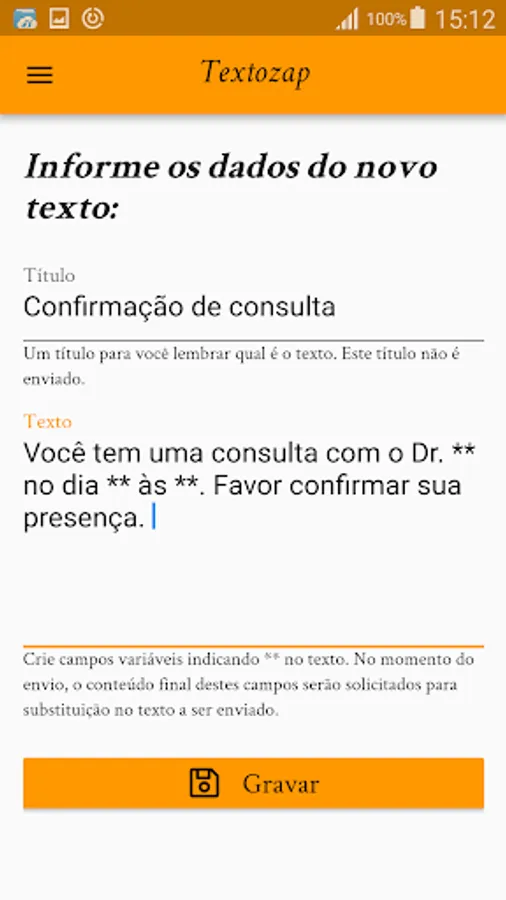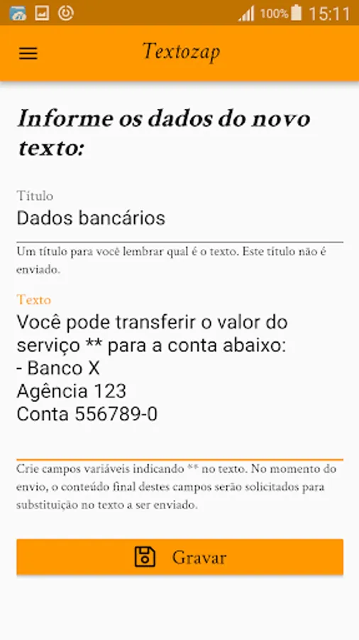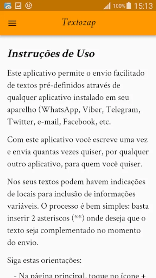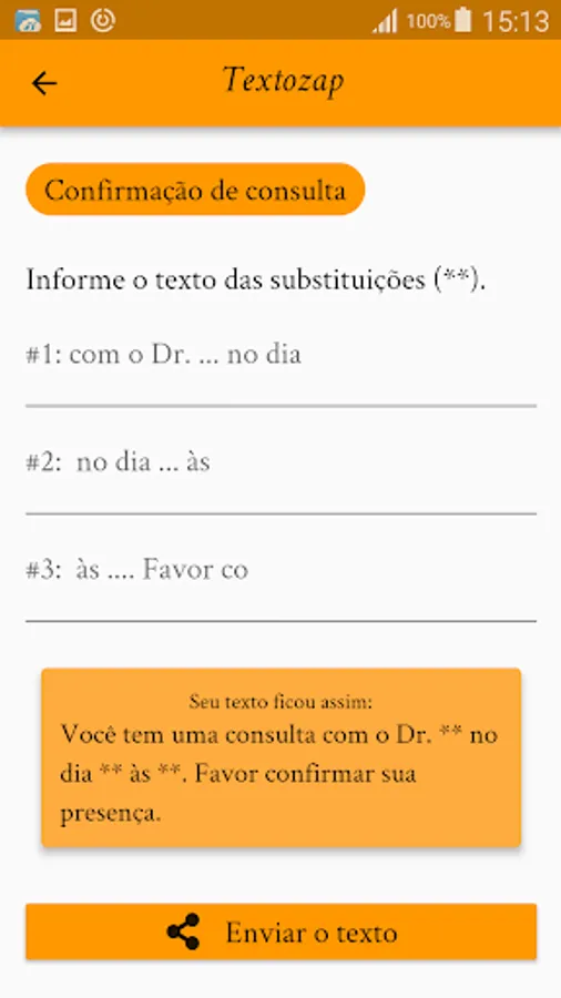 With this application you prepare your texts, whenever you need to send one of them, just choose and send to a person or a group of one of these messenger programs. If the text is fixed, just send it. If the recorded text allows the complement of variable information (substitutions), at the time of sending you can enter these variable complements.