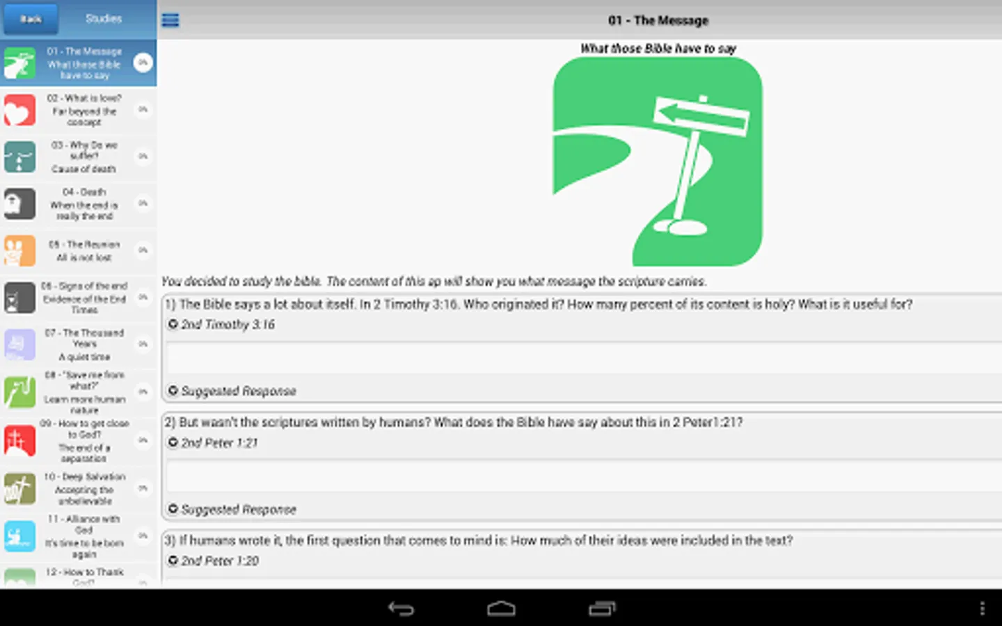 In a world with more than 33,000 Christian religions, it is only fair that you ask yourself some time: where to go? The question becomes even more profound when we consider that all these thousands of Christian religions derive from a single book. The Bible. That's why the "Bible Study The Way" is a study guide to allow you to study the scriptures and discover the answers that are so important to your life. Answers that surely will help you to walk the path of life by the better road. However, as with everything in life, the best way is not always the easiest. So many people give up studying the Bible with fear of not understanding it correctly. This application aims to help you navigate firmly by the word of God. Its major goal is guide you until you find: The Way.