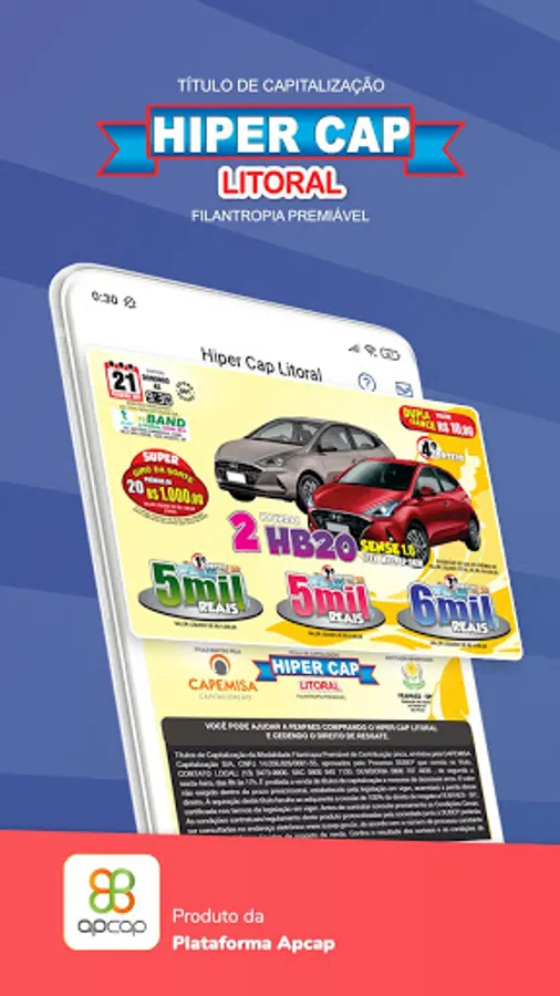 Single Contribution Award Philanthropy Capitalization Bond, issued by CAPEMISA Capitalização S/A, CNPJ 14.056.028/0001-55, approved by the SUSEP Process included in the title. LOCAL CONTACT: (13) 3233-1967. SAC 0800 940 1130. OMBUDSMAN 0800 707 4936, from Monday to Friday, from 8 am to 5 pm. The sale of capitalization bonds to minors under the age of sixteen is prohibited. The amount not required within the statute of limitations, established by the legislation in force, will result in the loss of this right. The acquisition of this title allows the purchaser to transfer 100% of the right of redemption to the Federation of Apaes of the State of São Paulo - FEAPAES, certified under the terms of the legislation in force. Before hiring, consult the General Conditions in advance. The contractual conditions/regulation of this product filed by the company with SUSEP can be consulted at the electronic address www.susep.gov.br, according to the process number contained in the proposal. Premiums net of income tax.