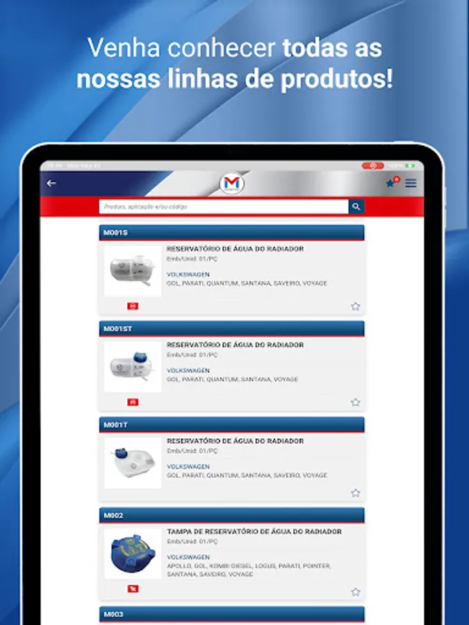 Marvini's electronic catalog allows you to easily find, through the original code or application, the most complete line of automotive reservoirs, in addition to the line of intake manifolds, air ducts, water flow tubes, reservoir caps. It is possible to view the photo of the piece, measure, weight, barcode.