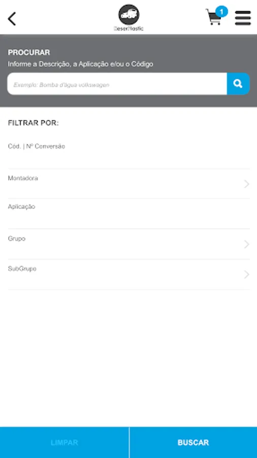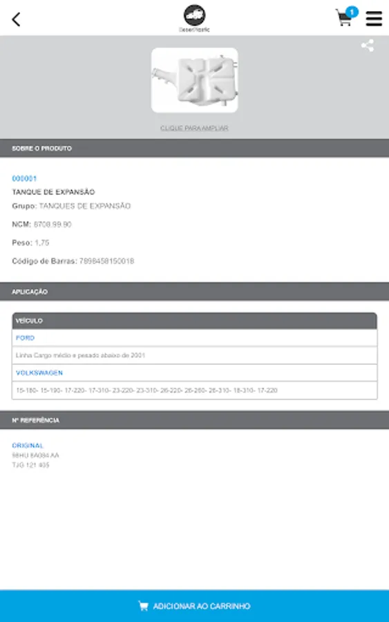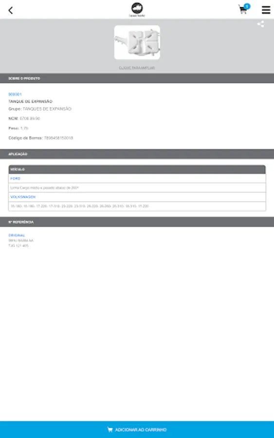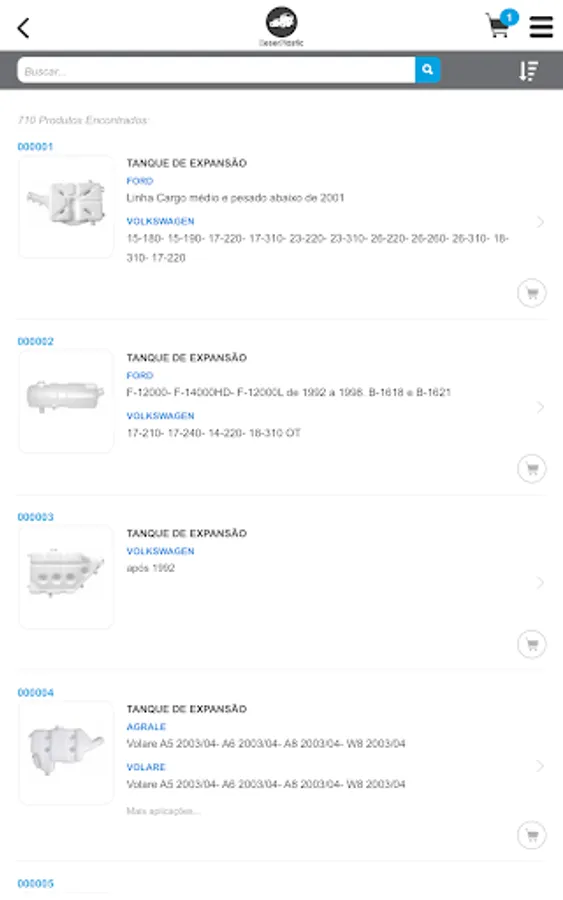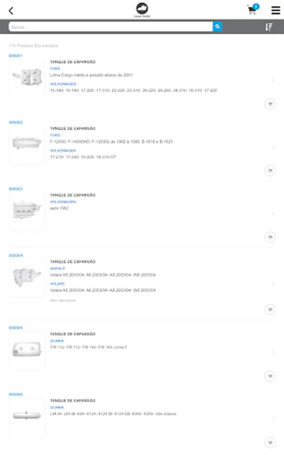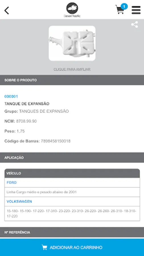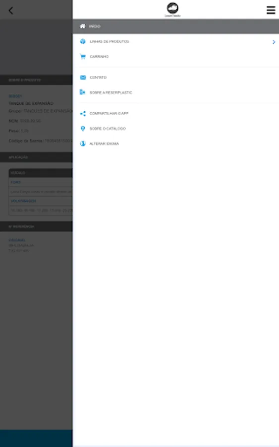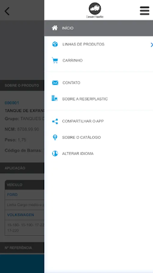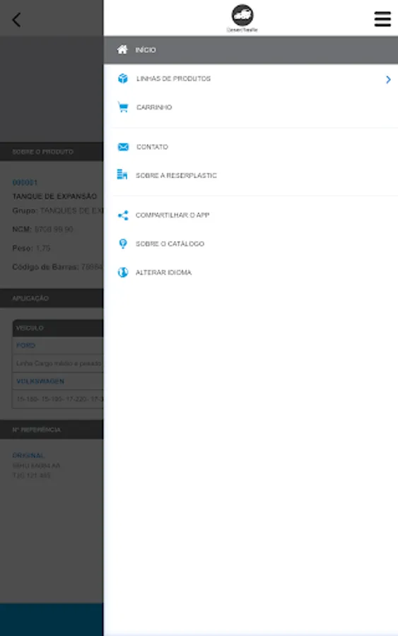 "Catalog in the form of software that allows you to query for parts supplied by the manufacturer ReserPlastic through its identification code, unique or application code. In this cnsulta you can view the photo of the piece and other data such as weight, NCM and barcode.