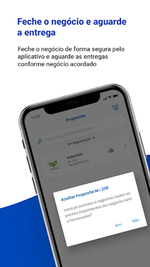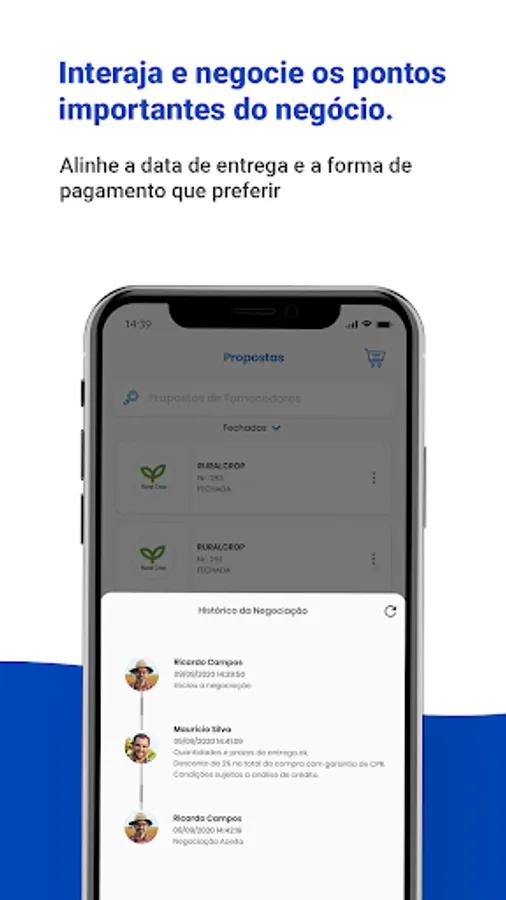 We are signing partnerships with the main suppliers of inputs so that you rural producer has greater agility and efficiency in your purchases and, if you need to talk and ask questions is very simple, just call your supplier directly through the application.
