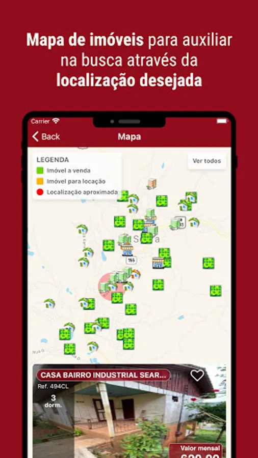 * Map with all properties and icons differentiated according to the type of property to assist in the search for the desired location;