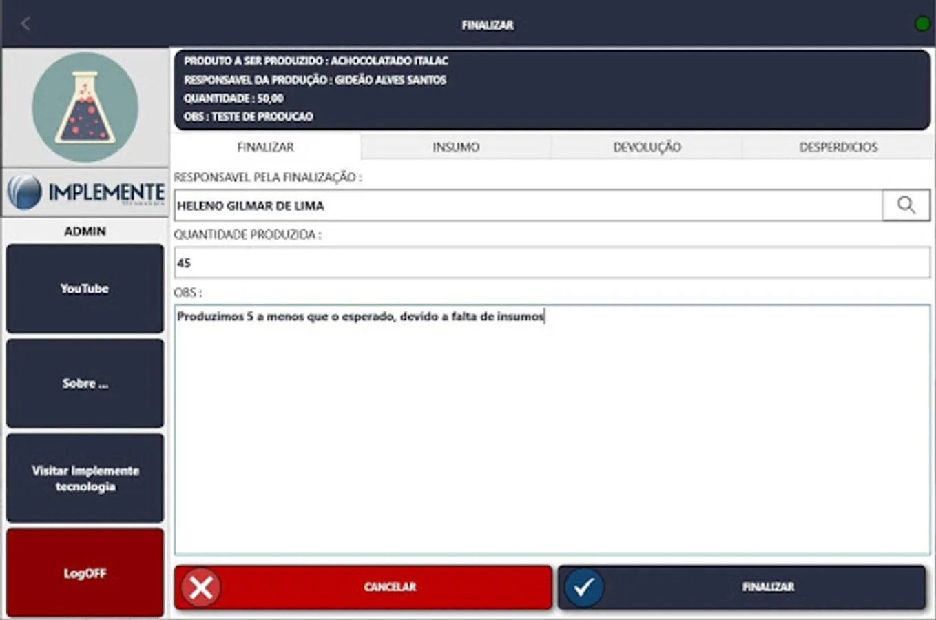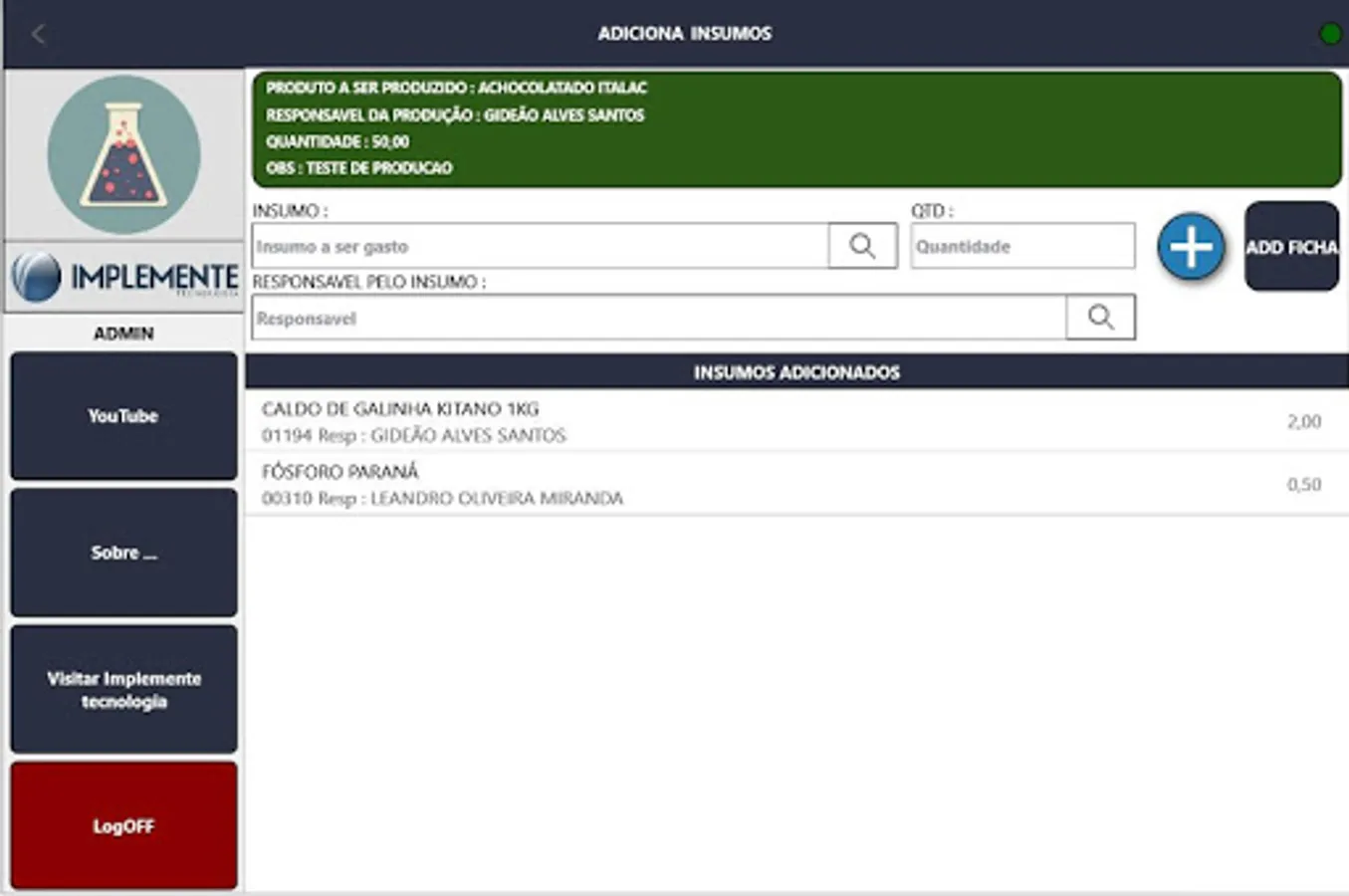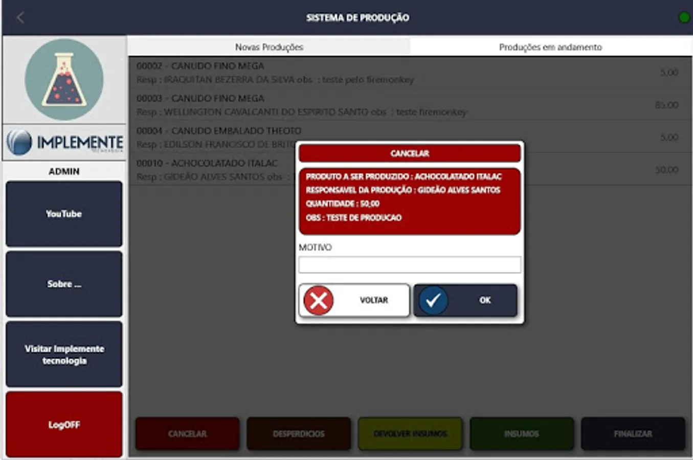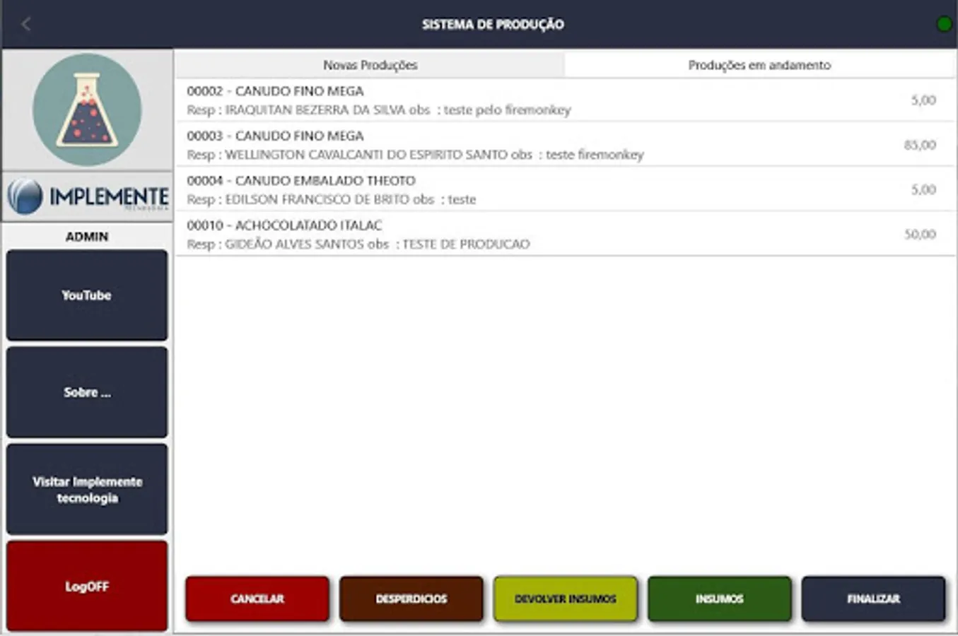 Integrated system to our system of restaurants, snack bars and bakeries (http://implemente.com.br/lanchonete.php). Where production is controlled by this app. If you are interested, log in or access www.implemente.com.br