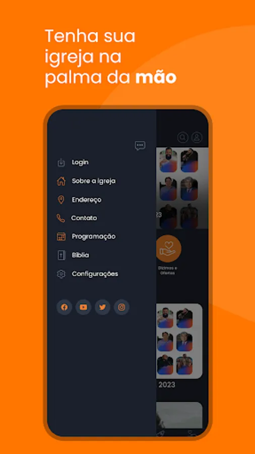 Resources available in the Application: News, Church Agenda, Events, Contents, Projects, Live Transmission and Teaching Module.