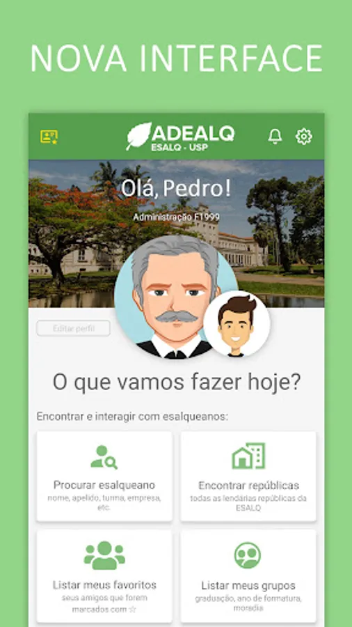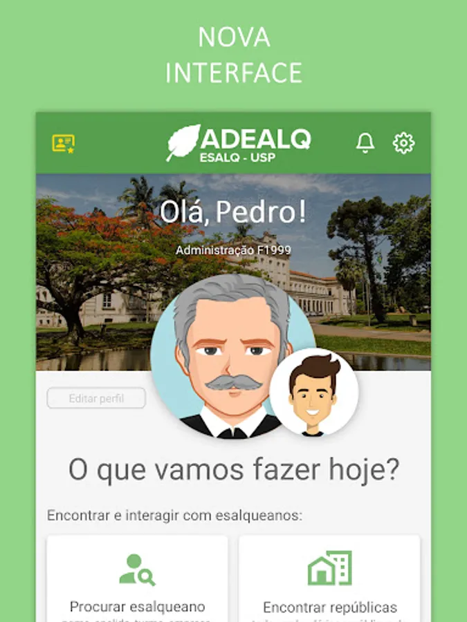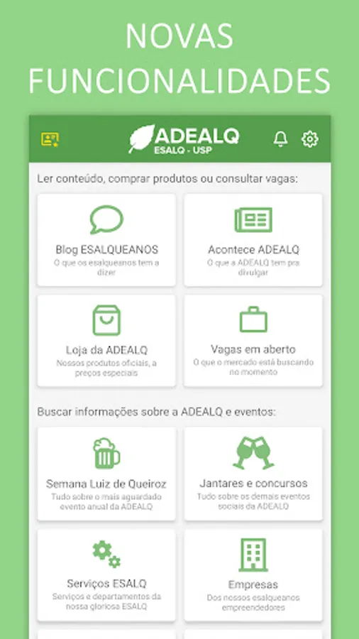 The application is free and allows you to find other ESALQ classmates, courses, republics, ESALQ services and ESALQ companies, as well as information about ADEALQ.