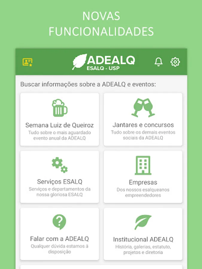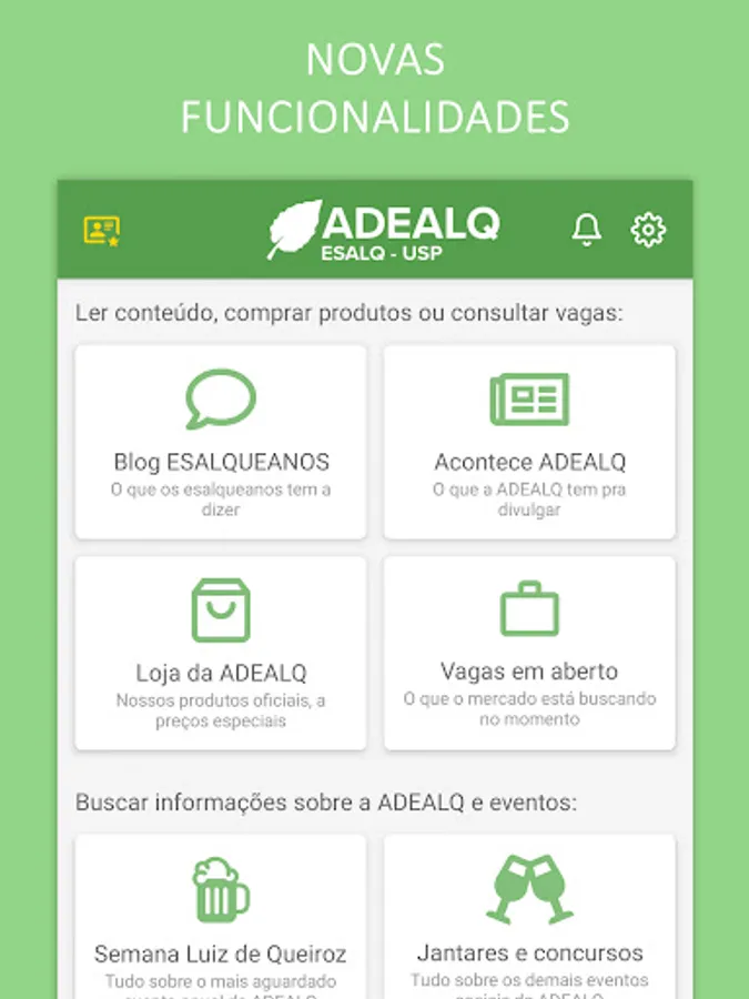 The ADEALQ ESALQUEANOS app is intended for all ESALQ alumni as an easy and quick way to consult all information and events of our association.